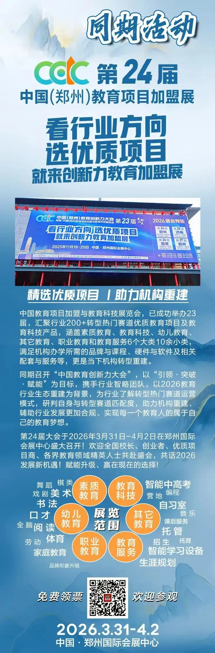 2026年3月31日——4月1日,第24届中国(郑州)教育项目加盟展将为你揭晓答案。这不仅是一场行业展会,更是你迈向‘凤凰涅槃’的起跑线。在这里,众多素质教育、研学实践、智慧托管的优质项目将集中亮相,帮助你一站式完成从传统托管到新型素质机构的资源升级。让我们相聚中原郑州这个教育之城吧,把政策信号转化为脚下的道路,共同开启托管行业的新征程。