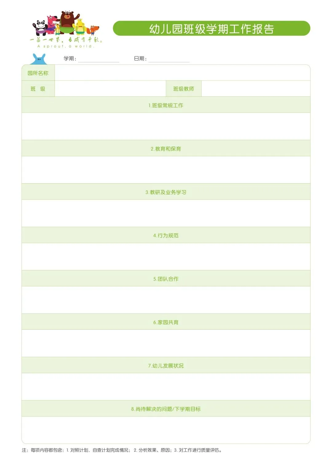 >幼儿园常用表格|幼儿园班级学期工作报告