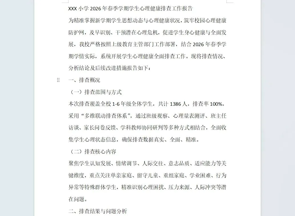 >小学2026年春季学期学生心理健康排查工作报告