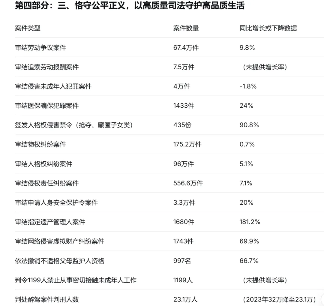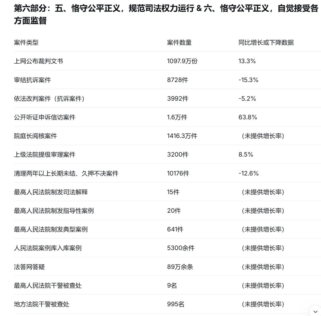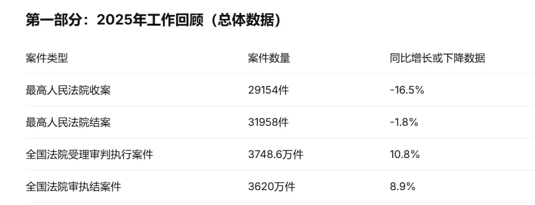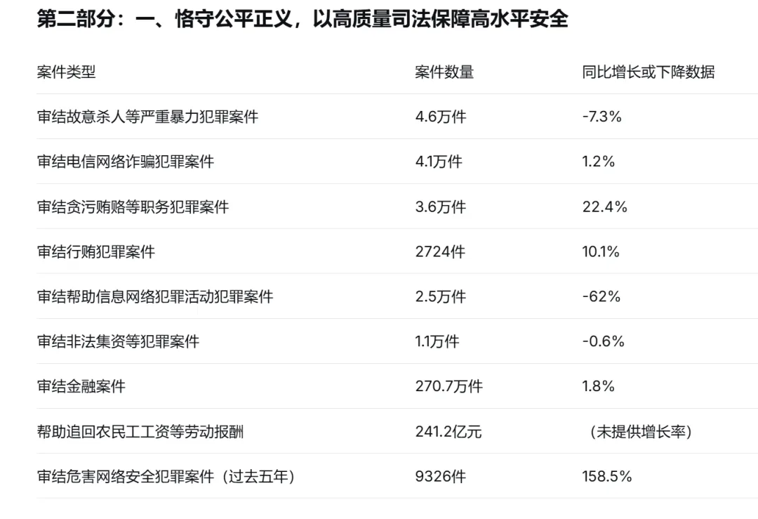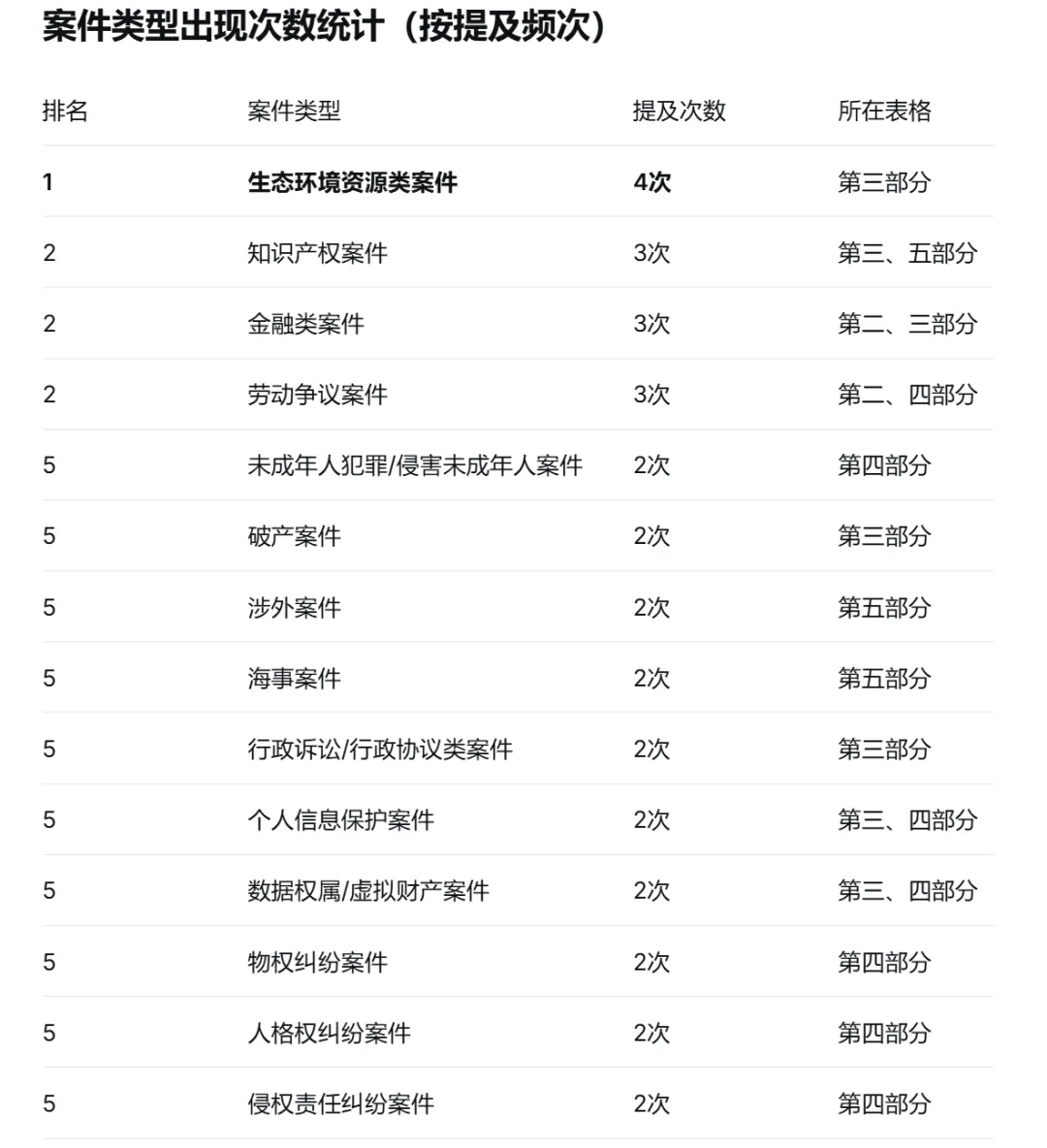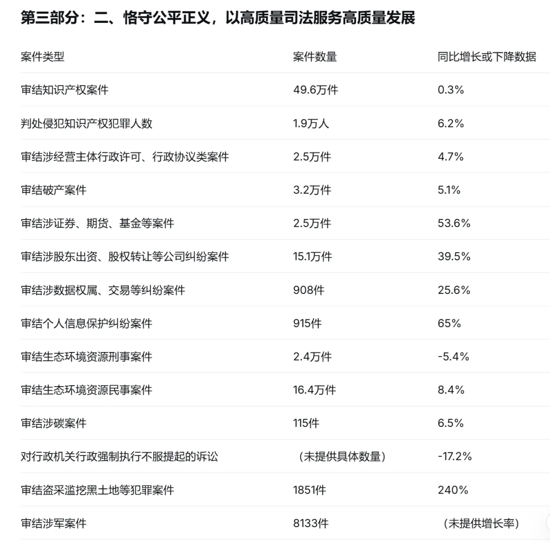 之所以,想到要去解读这份工作报告,是因为想了解一下目前诉讼领域的案件趋势,当然仅看这份报告,可能了解不到太多的内容,但也能瞥见一些司法动向。(报告原文:最高人民法院工作报告(全文)) 我这里借用了deepseek,帮我直接提取了相关数据,更加直观。 趋势一(总体):最高法的诉讼收案、结案量总体下降,而其他层级法院的审判执行收案、执结案件总体提升。总体诉讼量还是呈现增长趋势。 趋势二(刑事、金融领域)关键词“安全”:暴力犯罪的数量在减少,而贪污贿赂等职务犯罪、行贿案件的数量显著抬升,金融案件体量大,稳步抬升。 趋势三(知产、行政、破产、金融、公司、数据、个人信息、生态环境、涉碳等)关键词“高质量发展”:这其中知产案件是数量最多的(但非正常批量会被驳回,甚至司法处罚),而增长最快的领域主要出现在金融、公司、数据、个人信息保护四块(但后两个基数还是太少),行政、破产、生态环境资源民事案件稳步增长。值得一提的是,我国第二部法典《中华人民共和国生态环境法典》已审议通过,自2026年8月15日起施行。 趋势四(劳动、未成年犯罪、物权、人格权、侵权责任)关键词“高品质生活”:数量最多的侵权责任、物权、人格权、劳动争议(我想合同应该是最多的,但报告里没统计),比较出乎我意外的是人格权竟然有这么多案子,侵权、人格权、劳动争议类案件均稳步上升,网络侵害虚拟财产纠纷系新类型也上升显著,家事领域的人格权侵害禁令、撤销不适格父母监护人资格同样值得关注。 趋势五(涉外知产、海事、涉港澳台等)关键词“高水平开放”:涉外案件中审结较多的系知产案件,这个领域还是大有可为,其他类型的案件有点高大上,完全不熟悉。 趋势六:这部分主要看下最高法的工作,我觉得比较有用的是逛逛法答网、司法案例库。 最后,我看下在这份报告中,不同类型的案件出现次数:前四名分别是生态环境、知识产权、金融、劳动争议。不清楚大家看完这些数据能够领悟到什么,对于我来说,能看到的还太少。(最后,数据都是deepseek帮我初步统计的,没有细核,若有数据偏差请读者包容下。)