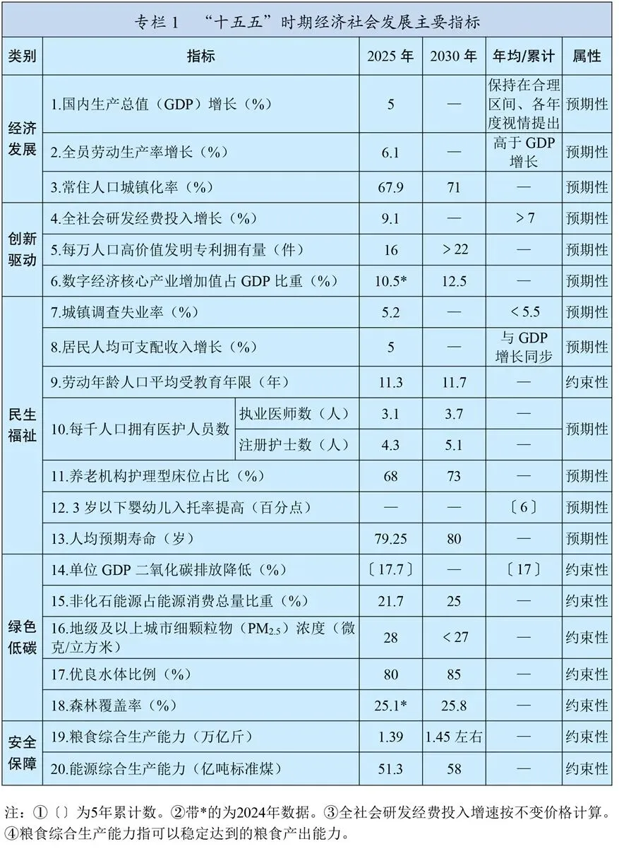 贯彻落实党中央《建议》明确的主要目标,《纲要(草案)》细化提出20项主要指标。经济发展方面,围绕增长、结构、效率提出3项指标。其中,综合考虑国内外形势和各方面因素,兼顾需要与可能,提出国内生产总值增长保持在合理区间、各年度视情提出,为到2035年人均国内生产总值比2020年翻一番、达到中等发达国家水平打好基础。创新驱动方面,围绕创新投入及其成效提出3项指标。其中,充分考虑研发投入增长趋势和企业投入能力,提出全社会研发经费投入年均增长7%以上,与“十四五”规划目标保持一致,确保研发投入力度不减。民生福祉方面,为更好解决人民群众急难愁盼问题,针对性提出就业、收入、教育、医疗、健康、“一老一小”等7项指标。绿色低碳方面,围绕降碳减污、生态环保等提出5项指标。其中,根据国家自主贡献目标,提出单位国内生产总值二氧化碳排放累计降低17%,继续推动重点领域绿色低碳转型。安全保障方面,围绕粮食、能源生产能力提出2项指标,着力夯实国家安全重要基础保障。