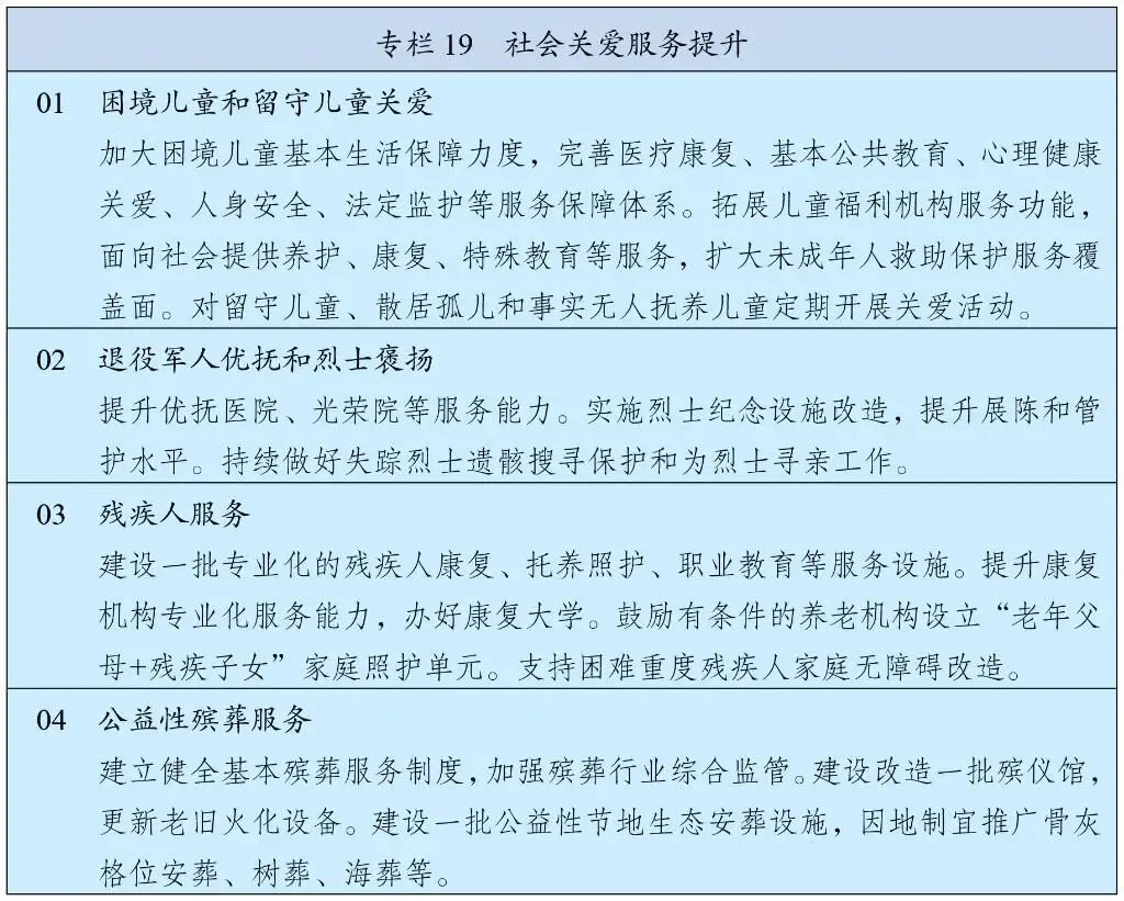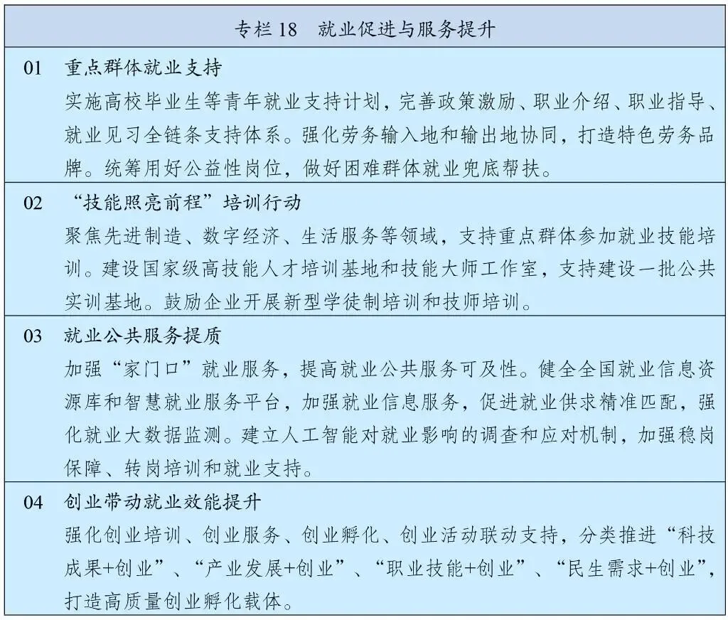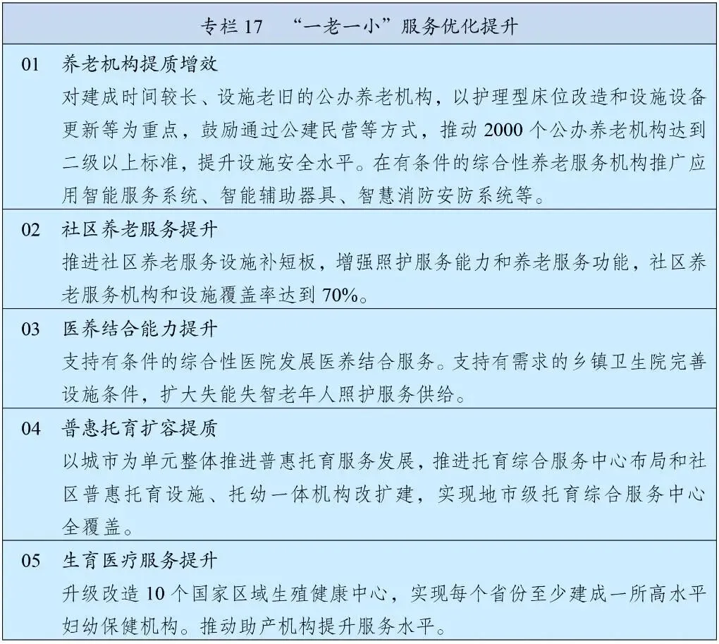 4.民生福祉方面7项指标:原文指出,民生福祉方面,为更好解决人民群众急难愁盼问题,针对性提出就业、收入、教育、医疗、健康、“一老一小”等7项指标。具体即表格中的城镇调查失业率、居民人均可支配收入增长、劳动年龄人口平均受教育年限、每千人口拥有医护人员数、养老机构护理型床位占比、3岁以下婴幼儿入托率提高百分点、人均预期寿命。可以说,这7项指标关注到了从出生到死亡这一完整链条中最主要的一些环节。用大白话来说就是:3岁以下婴幼儿谁来帮着带、上学问题怎么解决、毕业后工作怎么解决、工作了收入怎么增加、工作累生病了怎么办、退休后怎么养老?我到底能活多大岁数?——应该说群众关注的,国家都想到了。