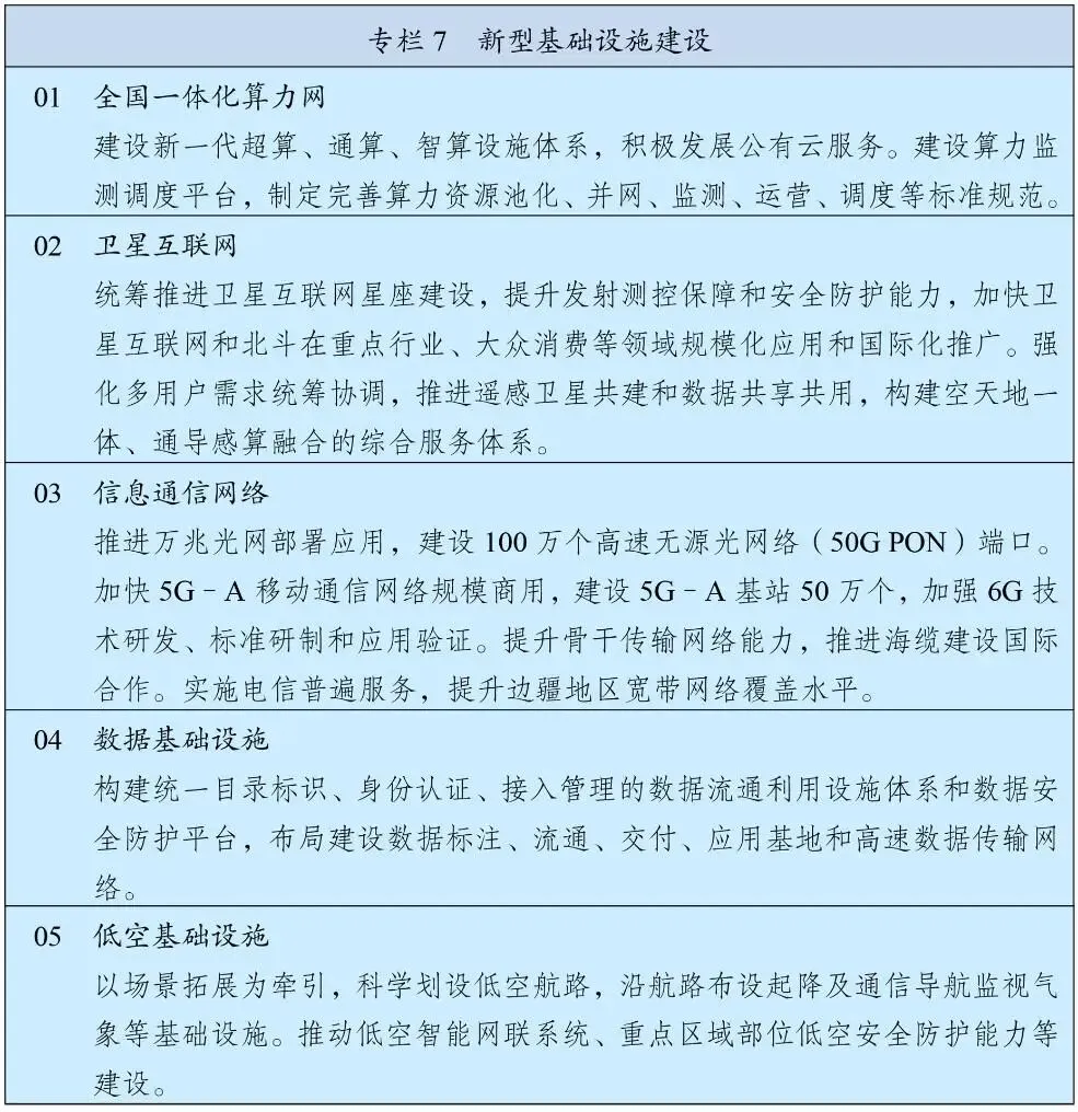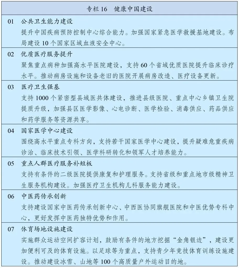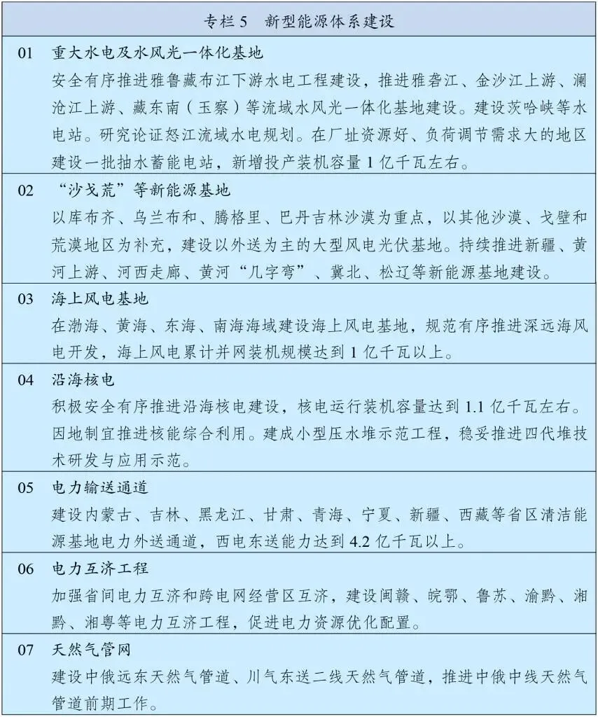 围绕推动“十五五”目标任务落实落地,统筹考虑战略性、牵引性和连续性,《纲要(草案)》提出6方面109项重大工程。引领新质生产力发展方面,围绕产业基础能力和竞争力提升、新产业新赛道培育发展、前沿科技攻关、创新基础能力提升提出28项工程。构建现代化基础设施体系方面,围绕国家综合立体交通网、新型能源体系、新型基础设施、对外开放平台等提出23项工程。促进城乡融合发展方面,围绕新型城镇化建设、农业农村现代化建设提出9项工程。保障和改善民生方面,围绕社会主义文化繁荣发展、高质量教育体系建设、健康中国建设、优化“一老一小”服务、社会关爱服务提出25项工程。推动绿色低碳转型方面,围绕碳达峰碳中和、环境质量提升、生态保护修复提出18项工程。重点领域安全保障方面,围绕粮食、能源安全等提出6项工程。这些重大工程兼顾当前和长远,既涉及“硬投资”也包含“软建设”。我们将注重以政府投资带动社会力量参与,更好发挥重大工程项目强基础、补短板、增后劲等重要作用。
