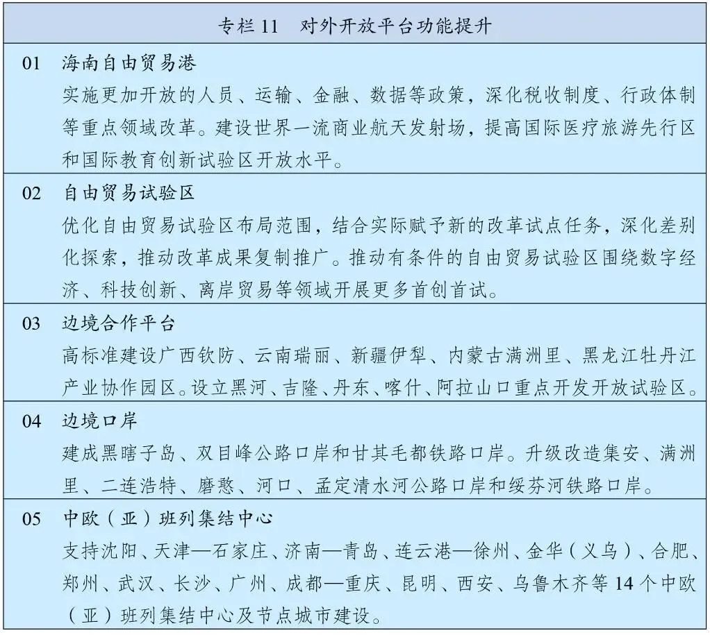 9.做强国内大循环四个着眼:即原文所说的《纲要(草案)》着眼增强国内大循环内生动力和可靠性、着眼充分释放我国超大规模市场红利、着眼增强高质量发展动力、着眼畅通国内国际双循环。前面我说了,贯穿十五五规划的主题是高质量发展,而高质量发展是在新发展理念指导下的发展,本部分体现了新发展理念中创新和开放这两大理念。本部分内容概括起来说,就是扩大内需和改革开放。