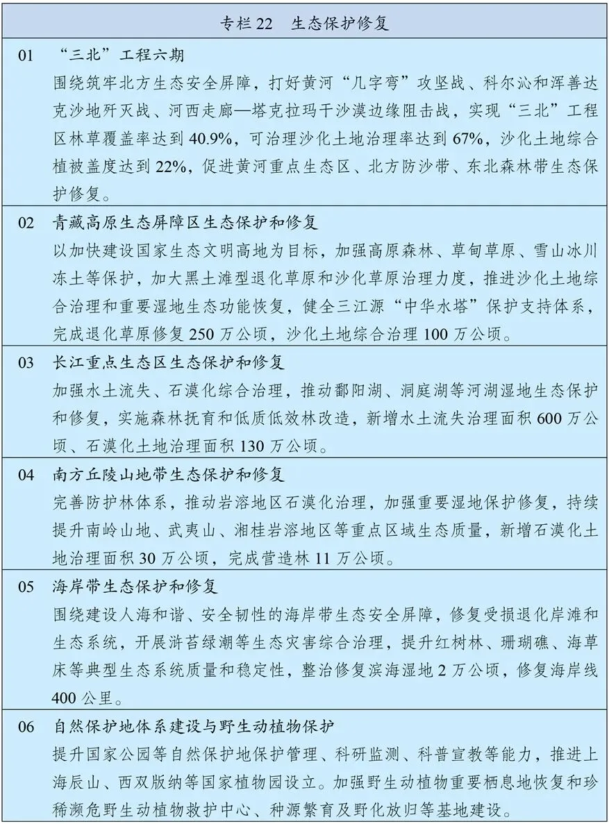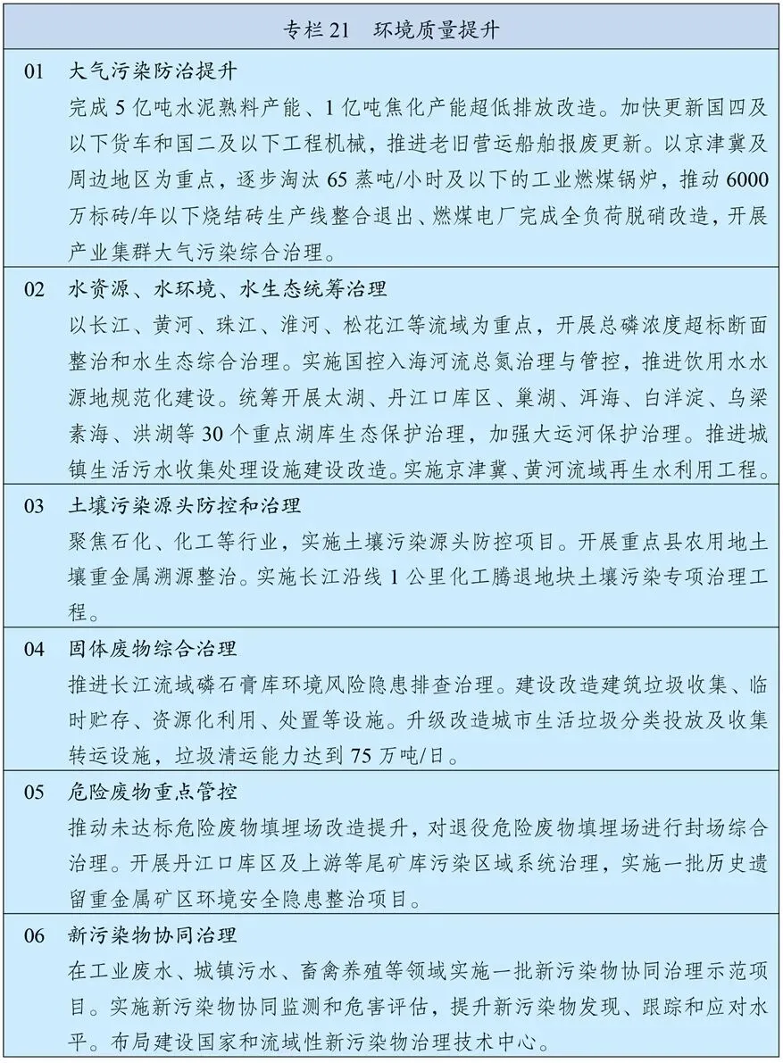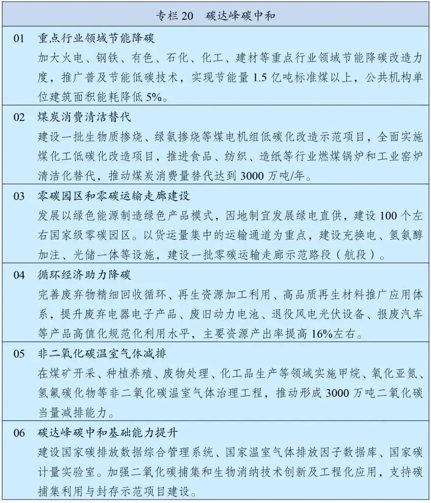 5.绿色低碳方面5项指标:原文指出,绿色低碳方面,围绕降碳减污、生态环保等提出5项指标。也就是表格中的单位GDP二氧化碳排放降低、非化石能源占能源消费总量比重、地级以上城市PM2.5浓度、优良水体比例、森林覆盖率。这里面的基本逻辑就是降碳、减污、扩绿、增长。其中单位GDP二氧化碳排放降低是降碳,非化石能源占能源消费总量比重既是降碳、也是减污、还是增长(比如新能源相关产业),地级以上城市PM2.5浓度、优良水体比例这两项指标分别从空气和水的角度确保减污,森林覆盖率体现的是扩绿。