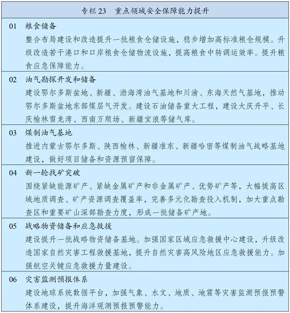 6.安全保障方面2项指标:原文指出,安全保障方面,围绕粮食、能源生产能力提出2项指标。也就是表格中的粮食综合生产能力、能源综合生产能力。为何是这两项指标?这里面一个是人的粮食,一个是经济发展的粮食,都事关最基本的生存问题。