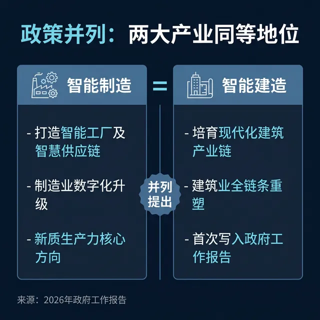 《2026年政府工作报告》(以下简称“报告”)首次将“发展智能建造”写入政府工作目标,与“智能制造”并列表述;《“十五五”规划纲要草案》(以下简称“纲要草案”)同步配套,从更长的时间跨度确立了数字化与绿色化的产业转型方向。