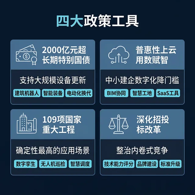 报告明确安排2000亿元超长期特别国债支持大规模设备更新。这笔资金不专门针对建筑业,但工程机械的电动化更新、建筑作业机器人(高空作业、焊接、抹灰)、智能模板和高精度测量设备,都属于设备更新覆盖的范畴。