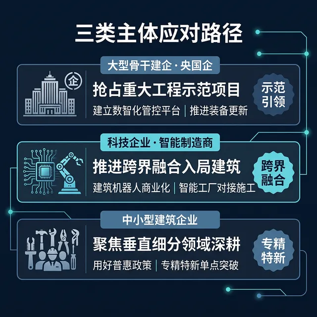 建议将重点放在两件事上:一是在国家级重大工程中选定2到3个项目,集中资源建立完整的智能建造示范体系,从中积累可扩展的经验;二是用好设备更新资金窗口推进重型施工装备的代际更新,为后续大规模实施打好硬件基础。示范先行,再谈推广,比全面铺开更现实。