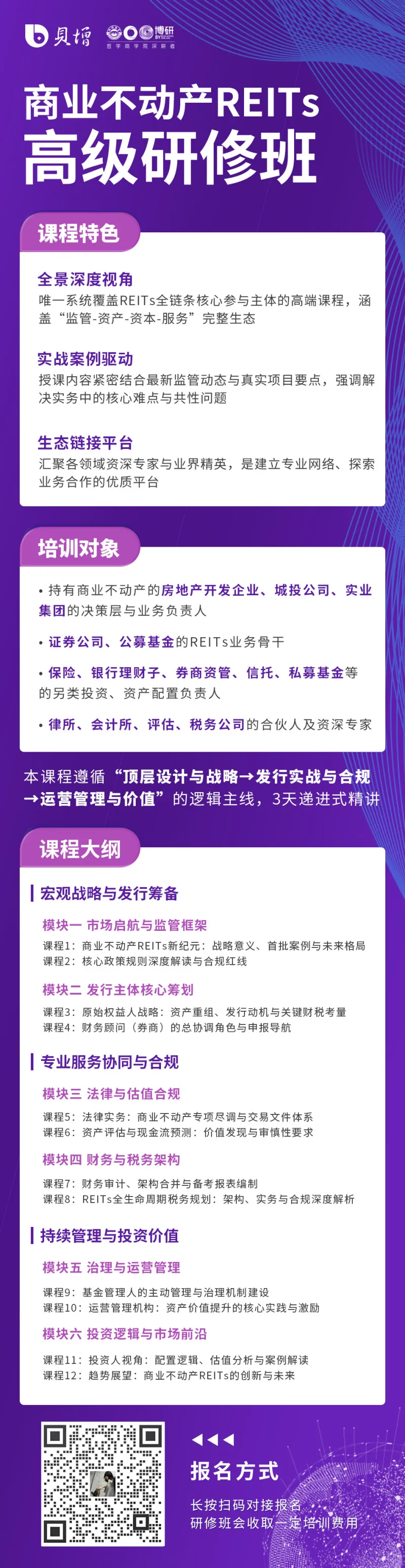 2026 年政府工作报告与十五五规划纲要,将城市更新与 REITs 确立为未来五年城市发展的核心双引擎,城市更新类 REITs 纳入审核绿色通道,政策红利与 20 万亿级市场窗口已全面打开。我们重磅推出REITs 全周期操盘高级研修班,汇聚监管政策专家、国内首单城市更新 REITs 操盘手、公募基金管理人,从最新政策解读、Pre-REITs 资产培育、合规梳理、发行申报到扩募再投资全流程深度拆解,帮你精准把握城市更新 REITs 的黄金发展机遇。