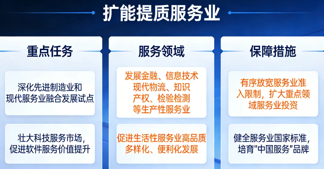 在生产性服务业方面,将重点发展金融服务、信息技术服务、现代物流、知识产权服务和检验检测等领域,以提升对实体经济的支撑能力。
