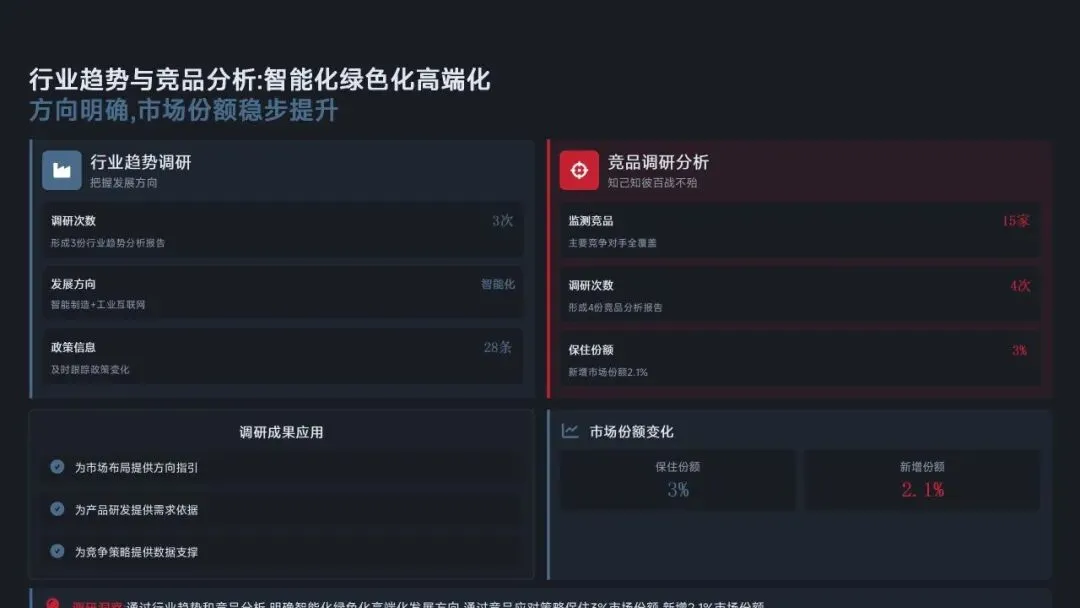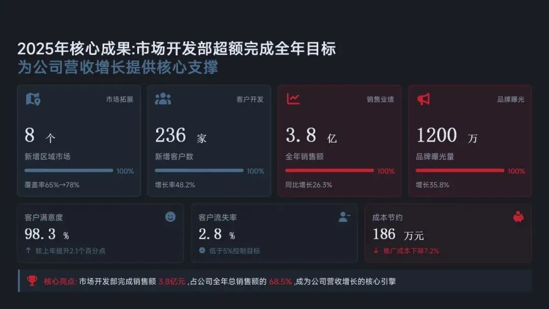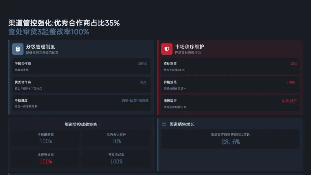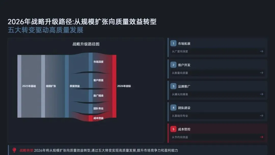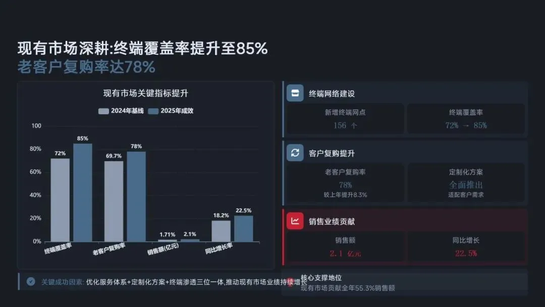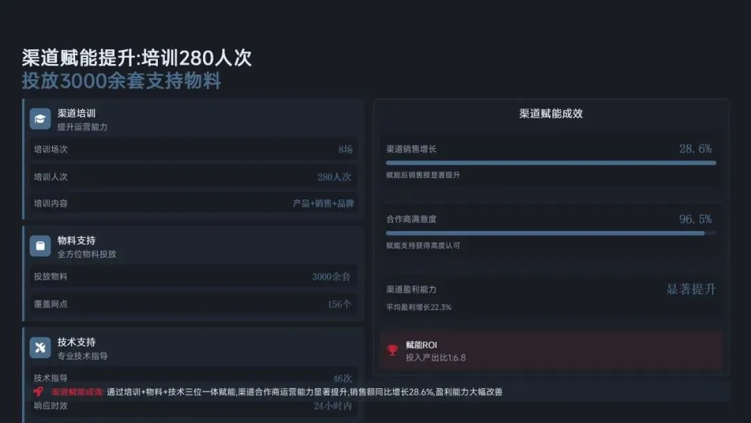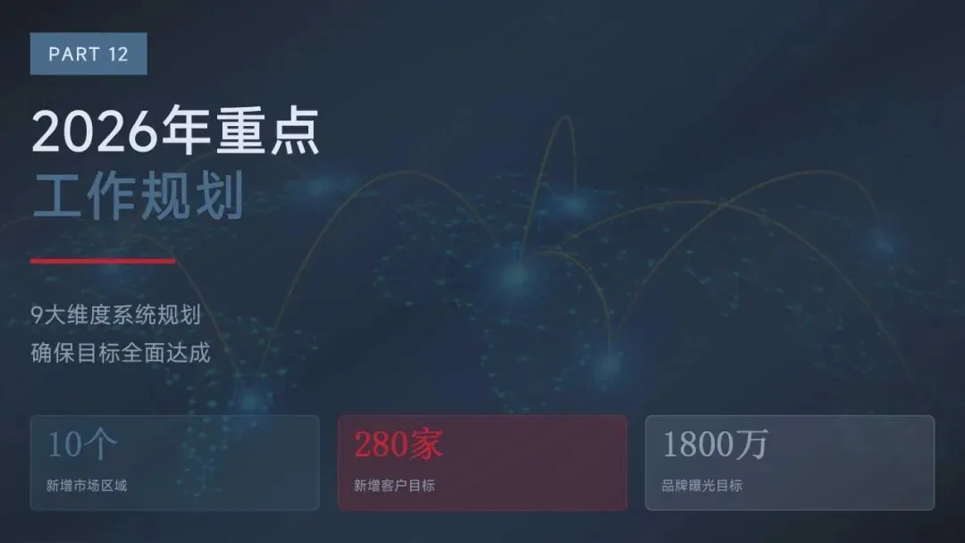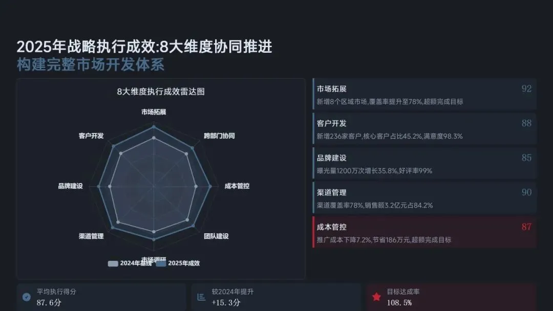 | 销售额3.8亿元(增26.3%),占公司总营收68.5%;8大维度平均执行得分87.6分,目标达成率108.5% | 销售额冲刺5.2亿元(增36.8%);从规模扩张向质量效益转型,五大方向升级 |