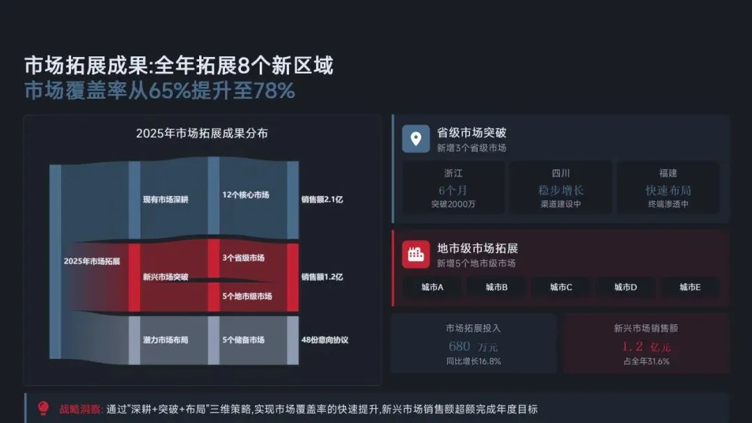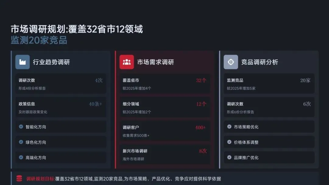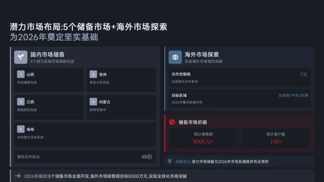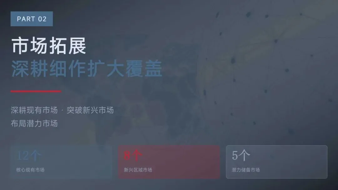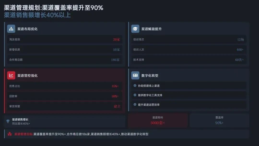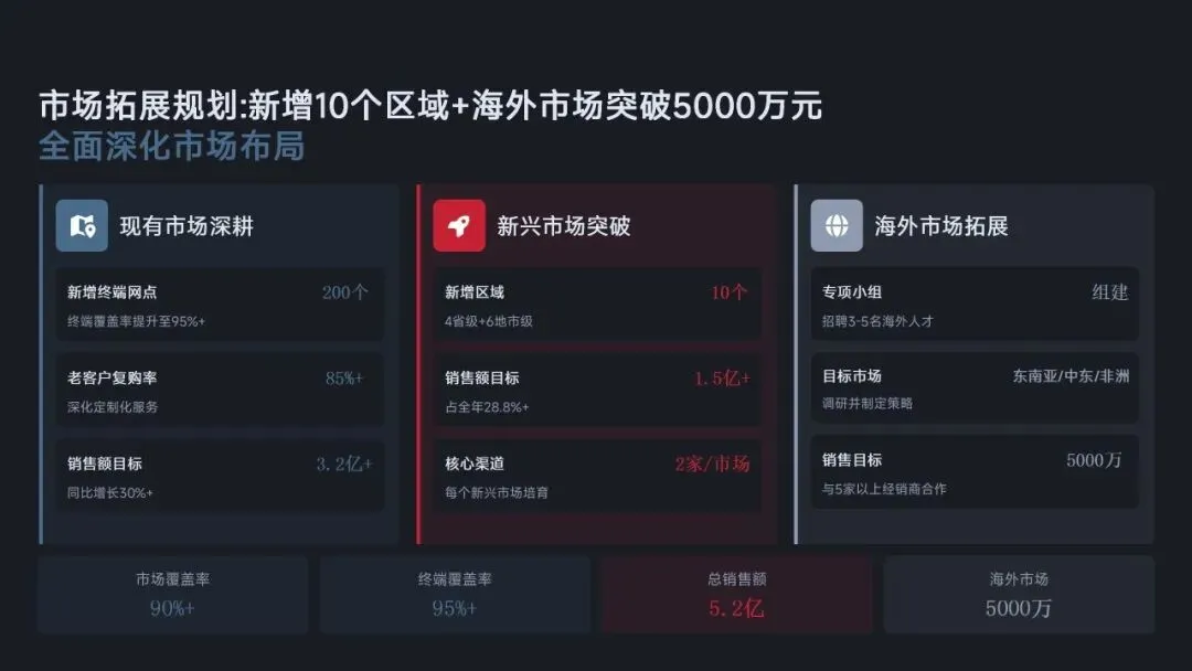 | 新增8区域,覆盖率78%;新兴市场销1.2亿,海外市场零突破 | 新增10区域(4省6市),覆盖率≥90%;海外销售目标5000万,主攻东南亚等区域 |