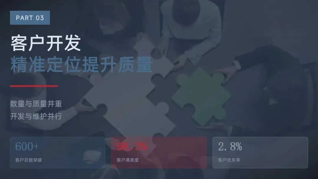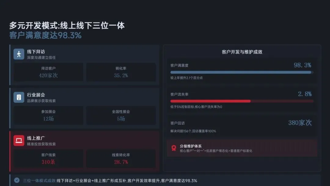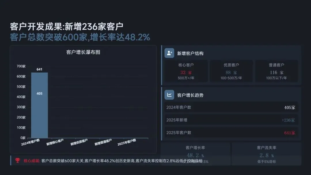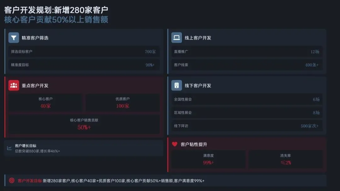 | 新增236家客户,总数641家;核心客户贡献45.2%销售额,满意度98.3% | 新增280家客户,总数≥880家;核心客户贡献超50%销售额,满意度≥99% |
