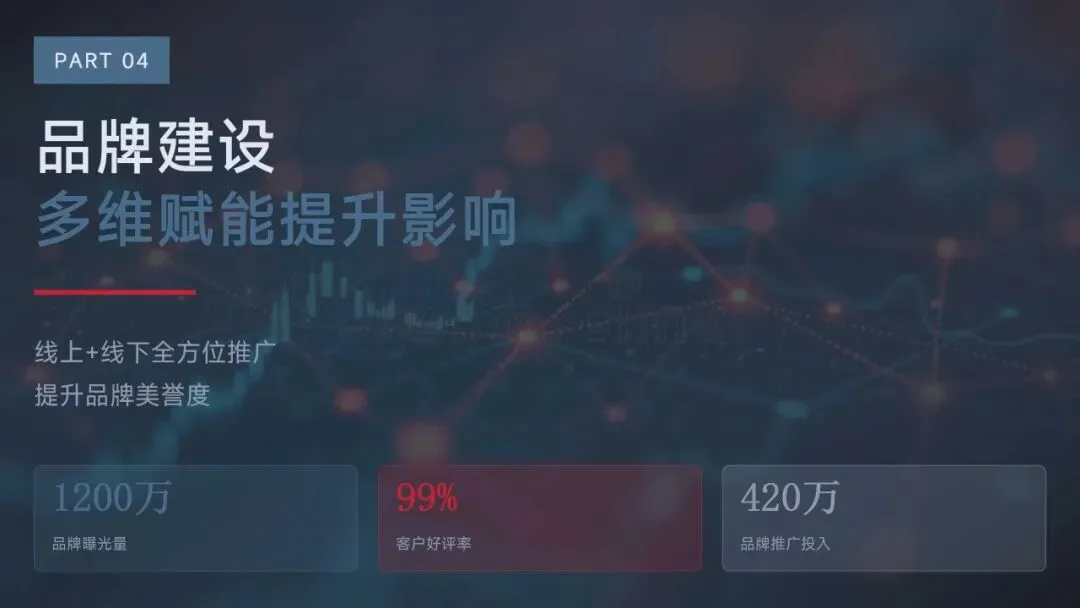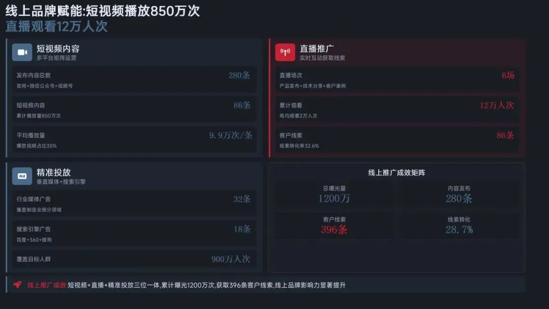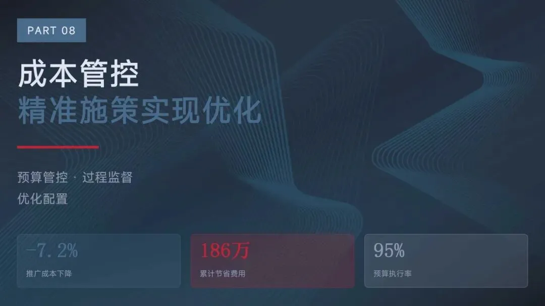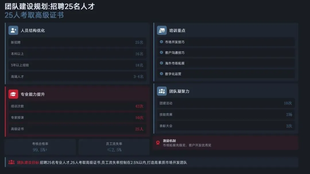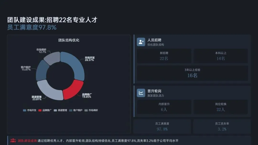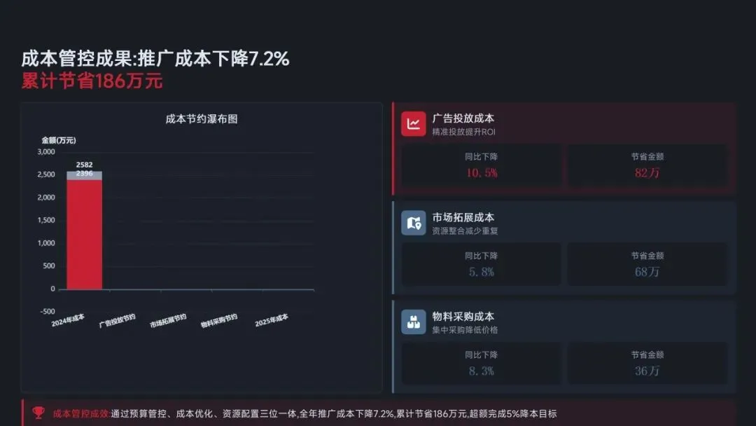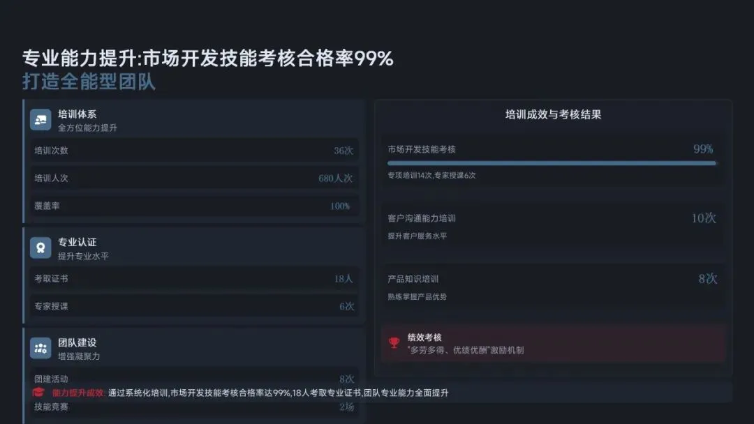 | 品牌曝光1200万次;降本186万(推广成本降7.2%);团队满意度97.8% | 品牌曝光1800万次;降本220万(推广成本降8%+);招聘25人,25人考取高级证书 |
