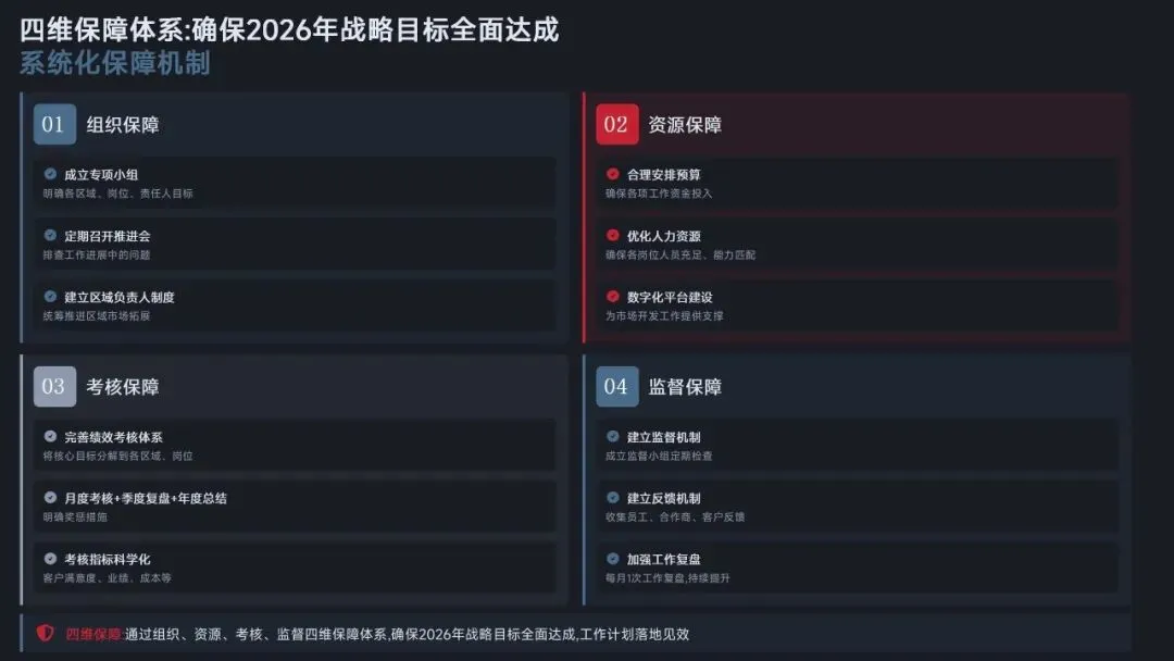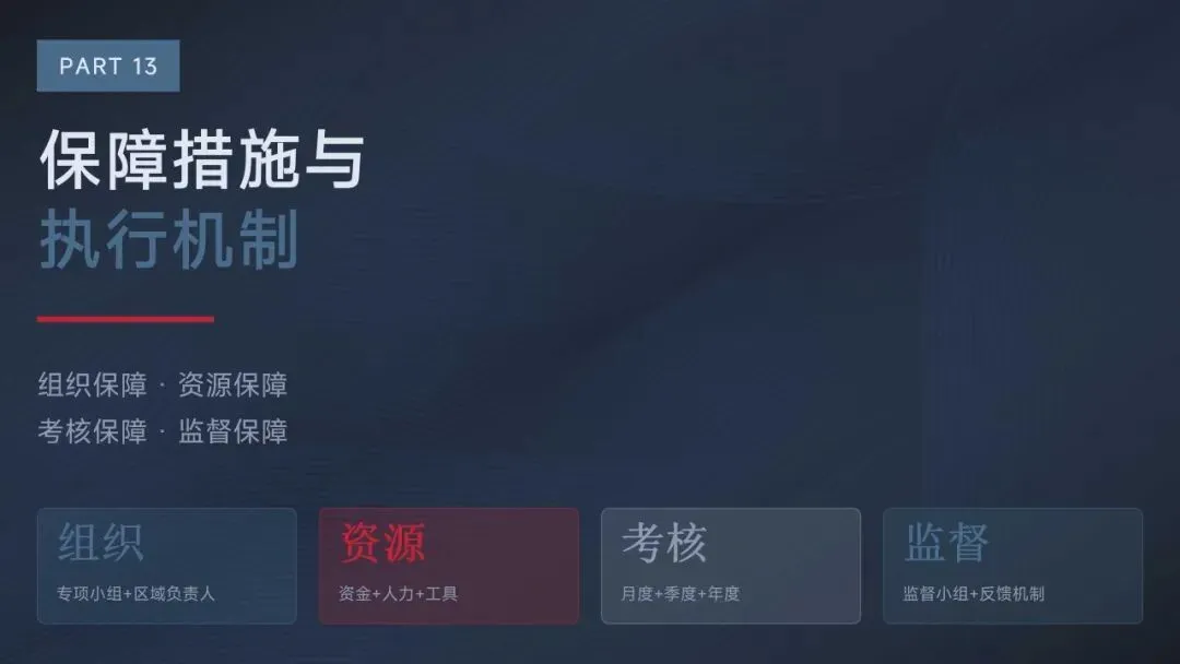 | | 9大维度系统规划,搭建组织、资源、考核、监督四维保障体系 |
