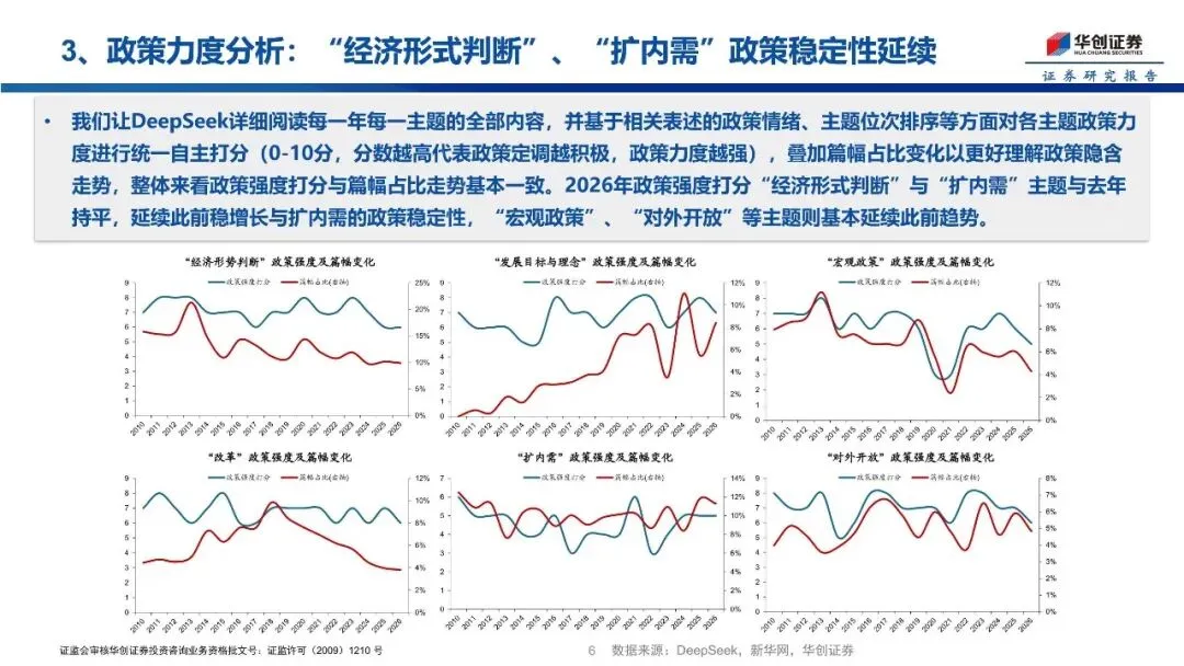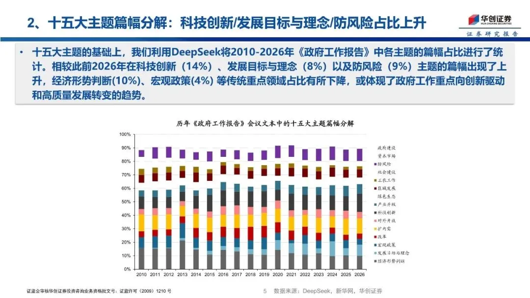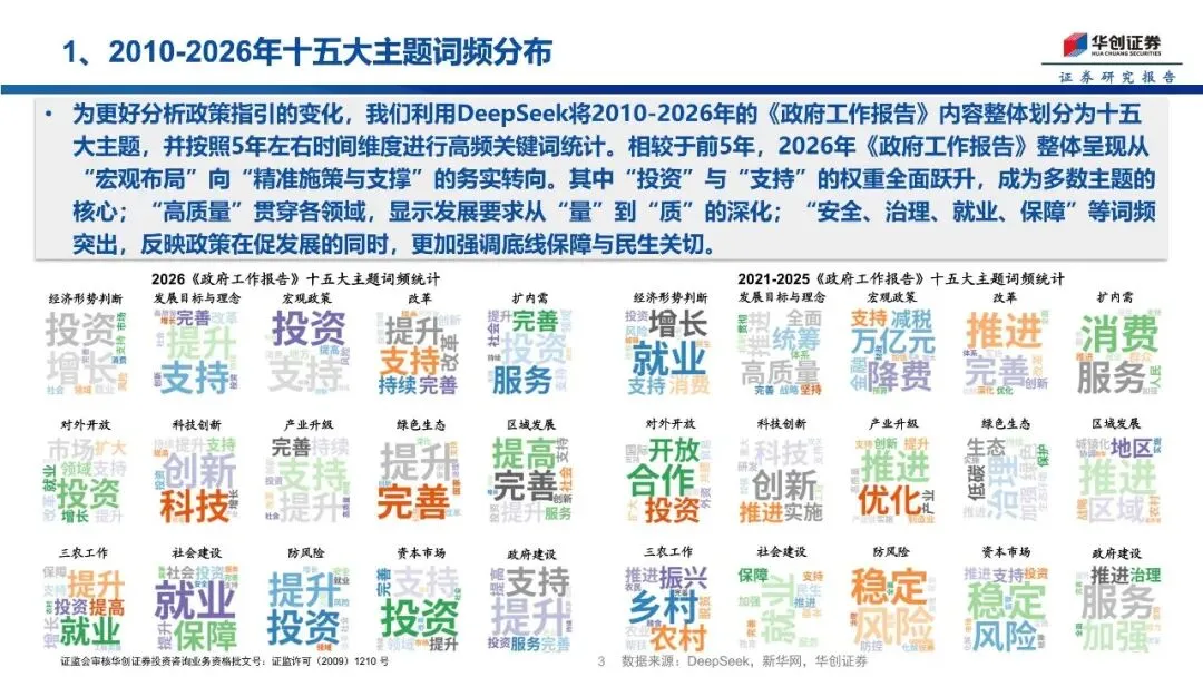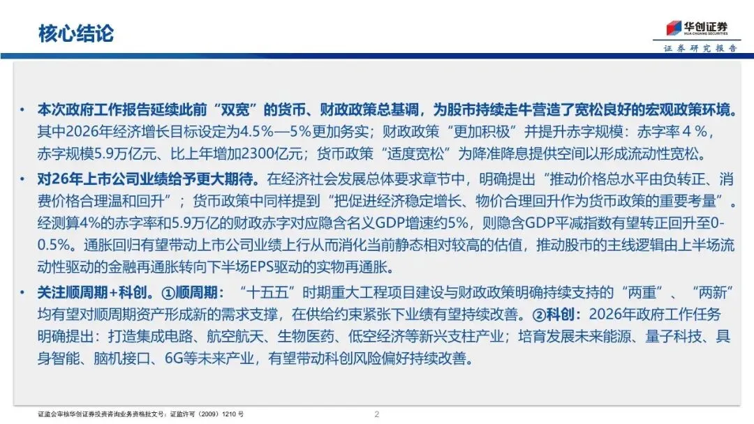 本次政府工作报告延续此前“双宽”的货币、财政政策总基调,为股市持续走牛营造了宽松良好的宏观政策环境。其中2026年经济增长目标设定为4.5%—5%更加务实;财政政策“更加积极”并提升赤字规模:赤字率4%,赤字规模5.9万亿元、比上年加2300亿元;货币政策“适度宽松”为降准降息提供空间以形成流动性宽松。