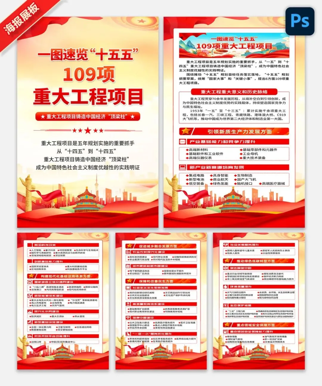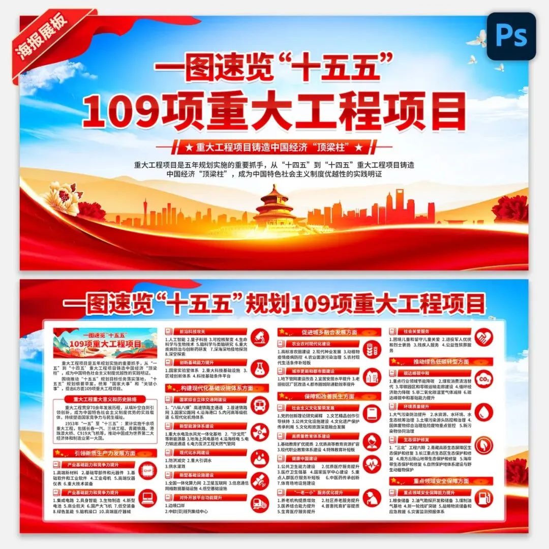 >【最新展板】2026年两会工作报告十五五109项重大工程项目展板宣传海报挂图PSD素材图片