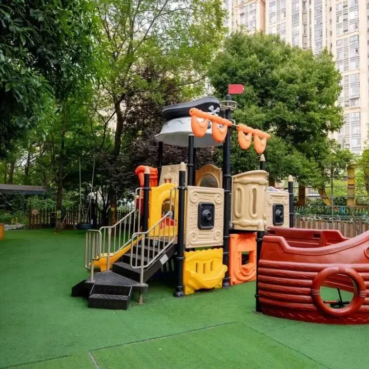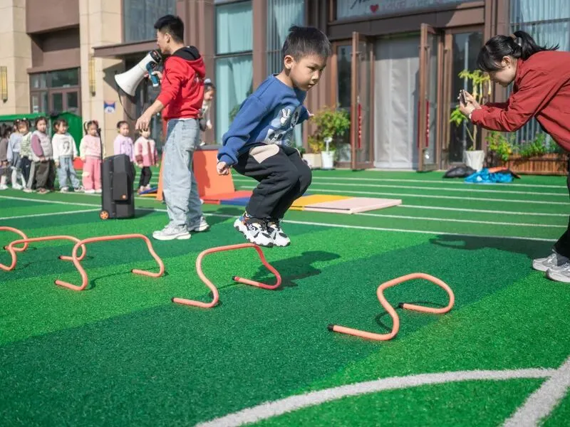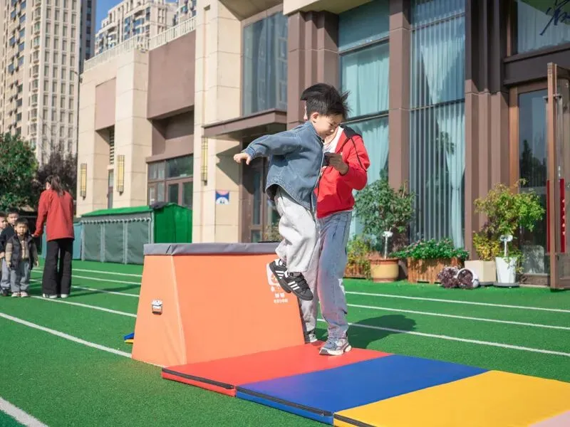 室外改造:新铺设的硅PU操场,用鲜艳的色彩和软隔断进行分区设计,满足幼儿跑、跳、爬等运动需求。“硅PU操场不仅防滑,且具有优异的弹性和缓冲性,更能保护幼儿柔弱的骨骼和关节。”园长蔡箐介绍。