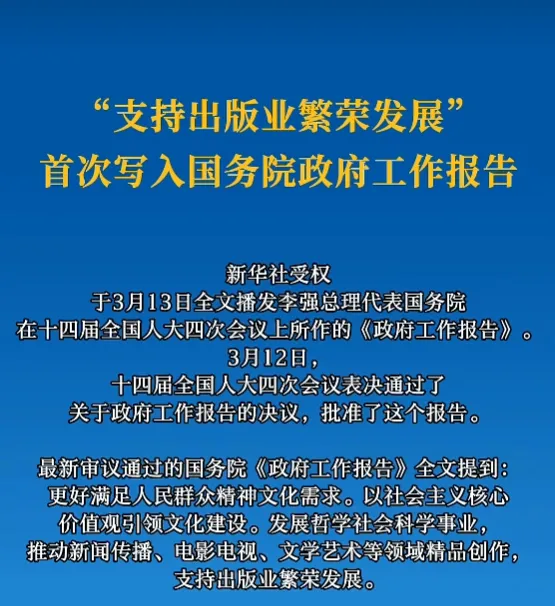 3月13日,新华社全文播发的《政府工作报告》中,有两行字格外醒目——“支持出版业繁荣发展”“支持实体书店发展”。这是自新中国成立以来,这两句话首次同时写入国家的最高施政纲领。