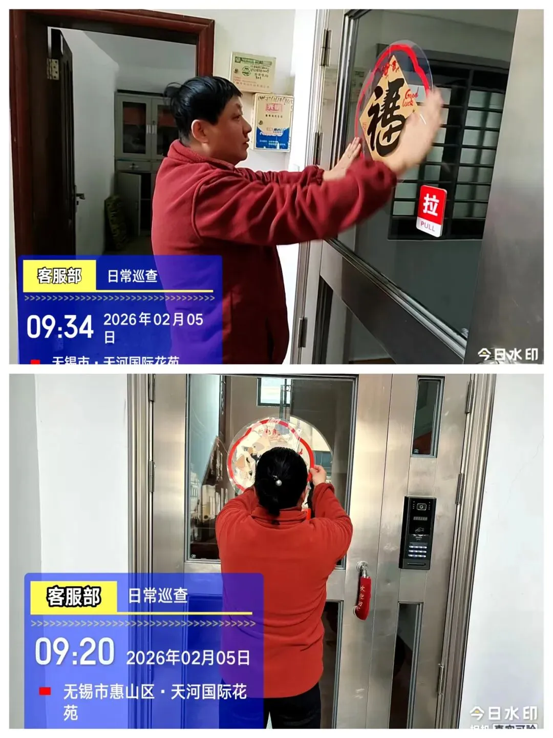 服务始于责任,温暖源于坚守。客服不断优化服务流程,确保每一位业主的声音都能及时听到并有效回应;每天巡查楼道、外围卫生情况,发现卫生死角,通知保洁及时清理;新春佳节来临之际,精心布置新春装饰,营造浓厚的新年氛围,假期间值班安排,保证节日期间服务不断。