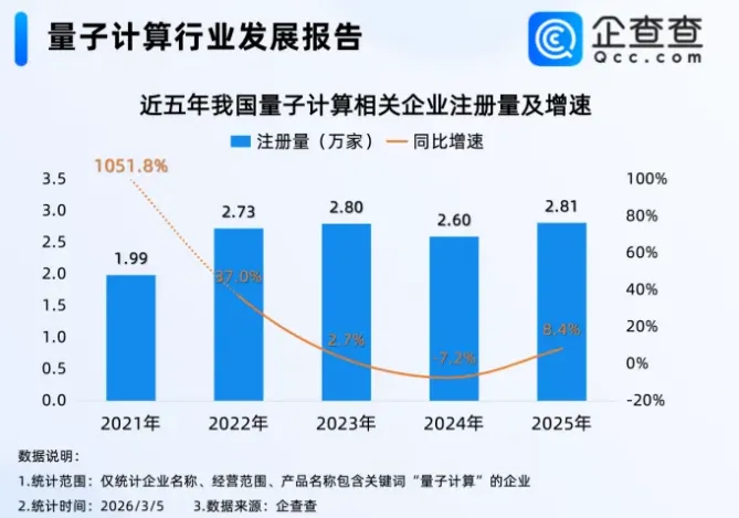 产业活力也体现在参与者数量的激增上。企查查数据显示,从年度注册量来看,我国量子计算相关企业注册规模自2021年迎来爆发后,整体保持稳定增长。2021年,我国量子计算相关企业累计注册1.99万家,较2020年同期增长超10倍;2022年至2024年,相关企业年度注册量持续稳定在2.6万家至2.9万家区间,2024年注册量为2.6万家,2025年进一步增至2.81万家,同比小幅增长8.4%,延续稳健增长态势。2026年行业发展开局良好,截至3月5日,全国已新注册量子计算相关企业3433家,为全年发展奠定基础。