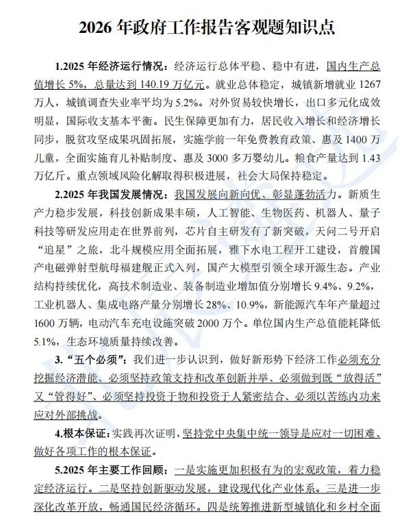 客观题是遴选笔试的基础分,也是拉开差距的关键,可政府工作报告内容繁杂、考点零散,逐字梳理太耗时,抓不住重点又容易丢分。这份《2026年政府工作报告客观题知识点》精准破解备考难题,把报告核心考点系统拆解、分类梳理,从2025年发展成果、“五个必须” 核心要义,到 “十五五” 目标指标、2026年工作要求,再到各类高频关键词、核心数字考点,全部清晰罗列,不用你再费时提炼,直接背诵记忆即可。