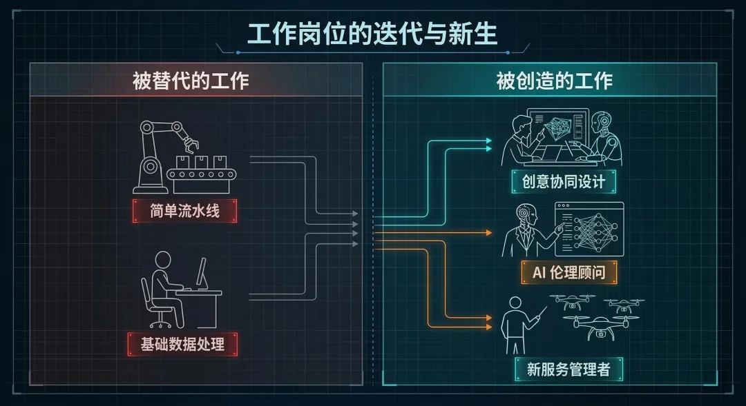 ③ 建立AI替代风险评估机制:动态监测哪些行业、哪些职业受冲击最大,为受影响的劳动者提供转岗培训和就业支持。