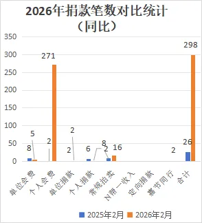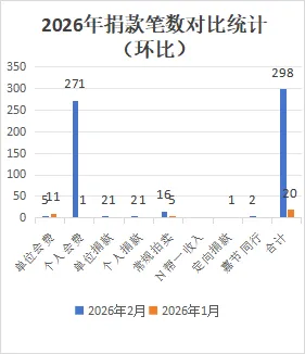 本月捐款收入共298笔,其中单位会费5笔,个人会费271笔,单位捐款2笔,个人捐款2笔,常规拍卖16笔,嘉节同行2笔。环比大幅度上升,同比大幅度上升,主要原因是2026年存量个人会费缴纳集中在同一时间。