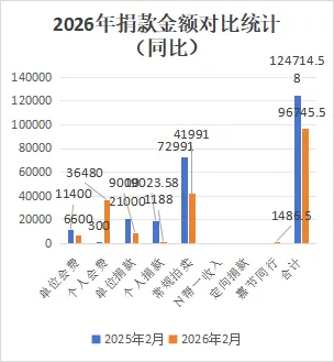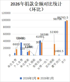 本月捐款收入共96745.5元,其中:单位会费6600元,个人会费36480元,单位捐款9000元,个人捐款1188元,常规拍卖41991元,嘉节同行1486.5元。环比略有下降,同比有一定的下降,为去年同期的77.57%。主要原因是2025年2月单位会员会费缴纳,单位捐款、个人捐款较为集中,导致同期基数略高。