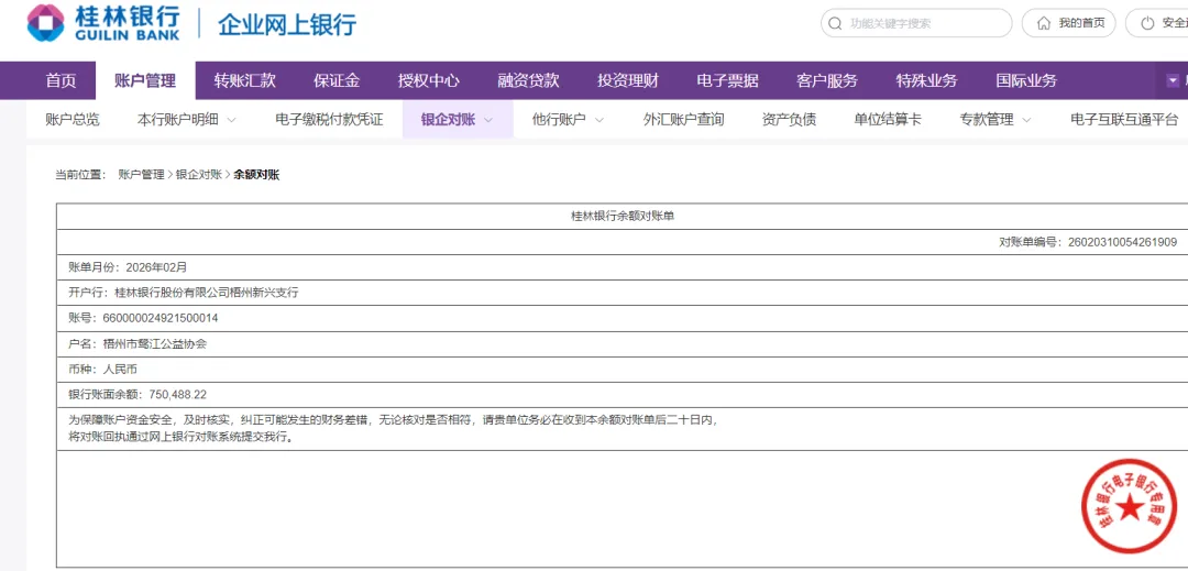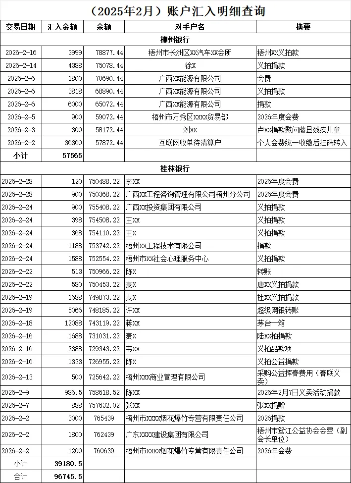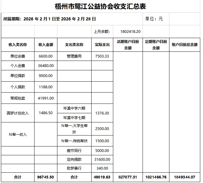 截至2026年2月28日,协会银行账户总体余额为:1849344.07元(活期账户余额为827877.31元,定期账户余额为1021466.76元)。其中: