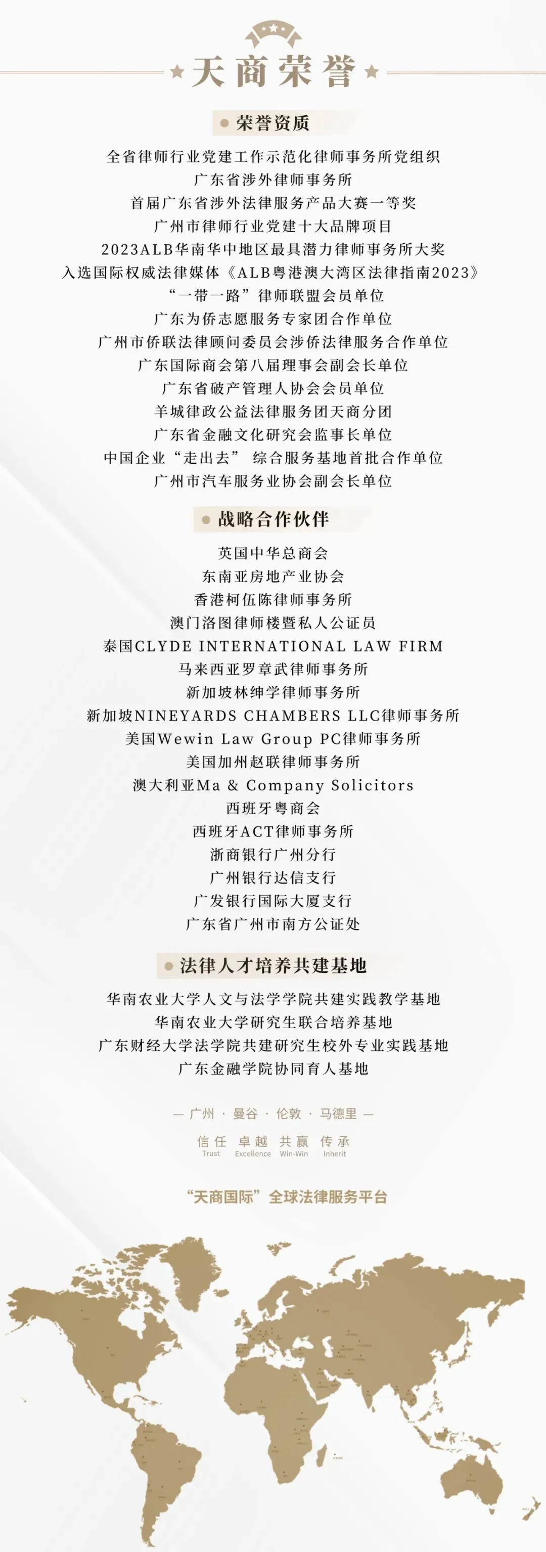 本微信公众号所发布的文章仅代表作者个人观点,不得视为广东天商律师事务所及其成员所出具的任何法律意见或建议。如需引用请注明出处,未经授权不得转载。如有任何问题,请与本所联系,谢谢!
