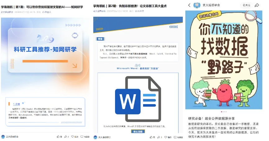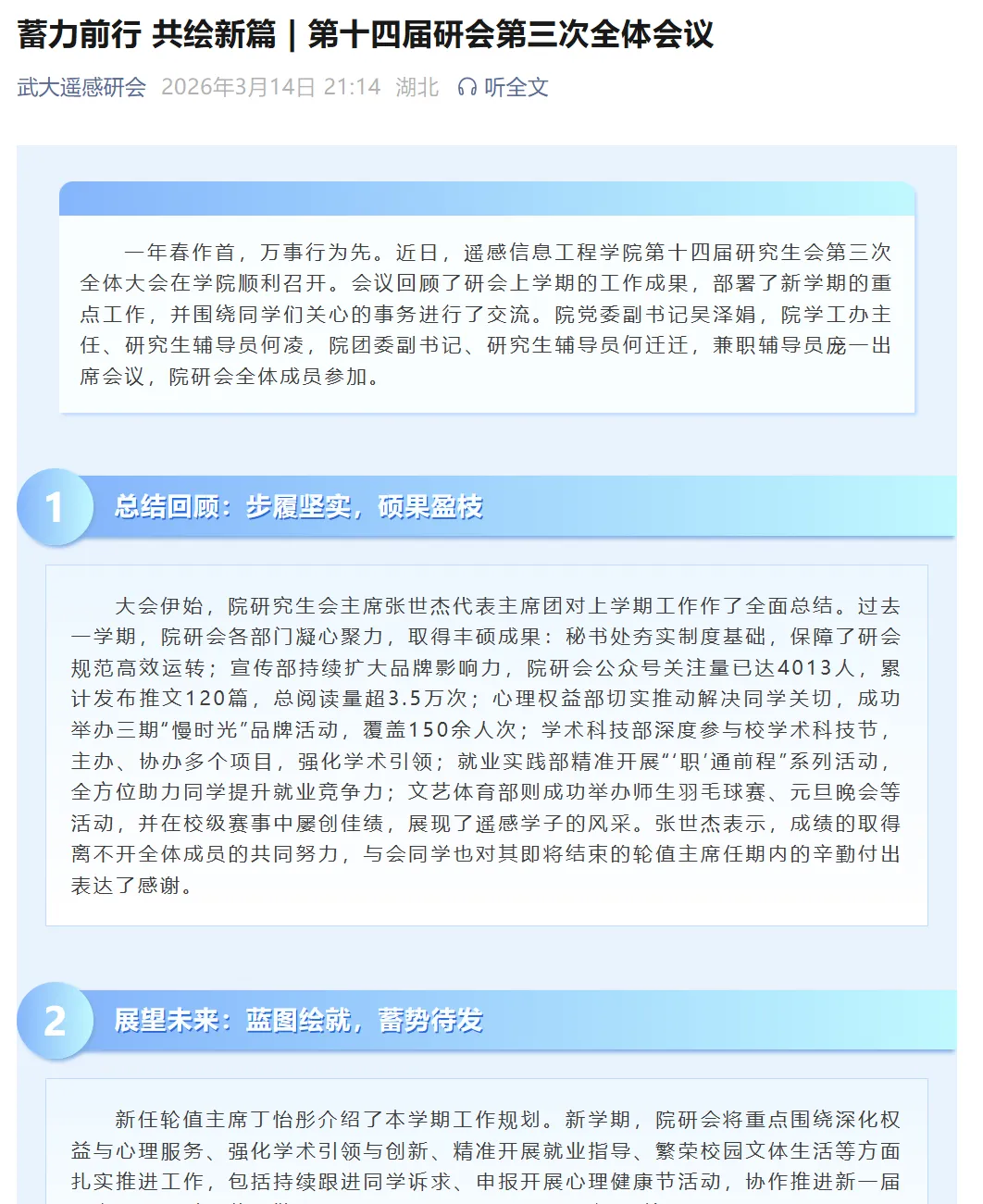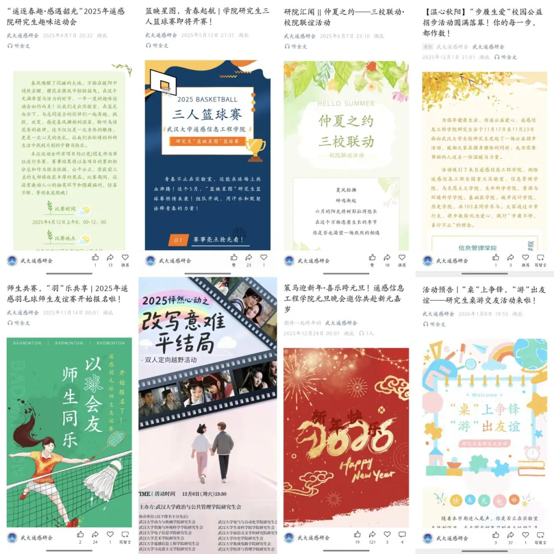 武大遥感研会公众号自2025年3月16日至2026年3月16日实现关注量稳步增长,发布大量高质量原创推文,并积极向校级媒体投稿;小红书平台也同步发力,充分做好平台日常运营工作。