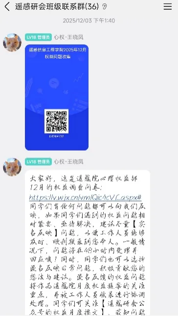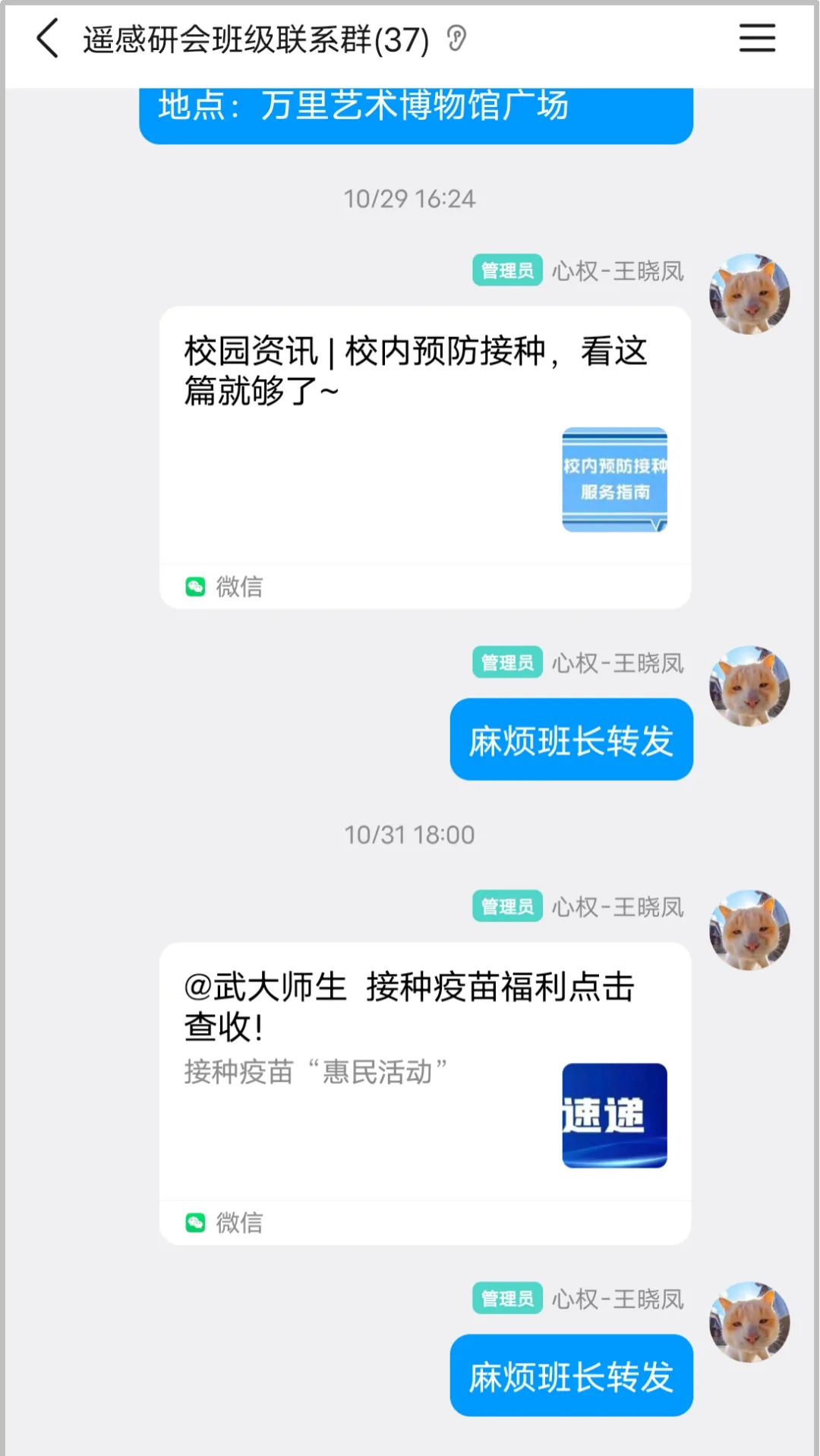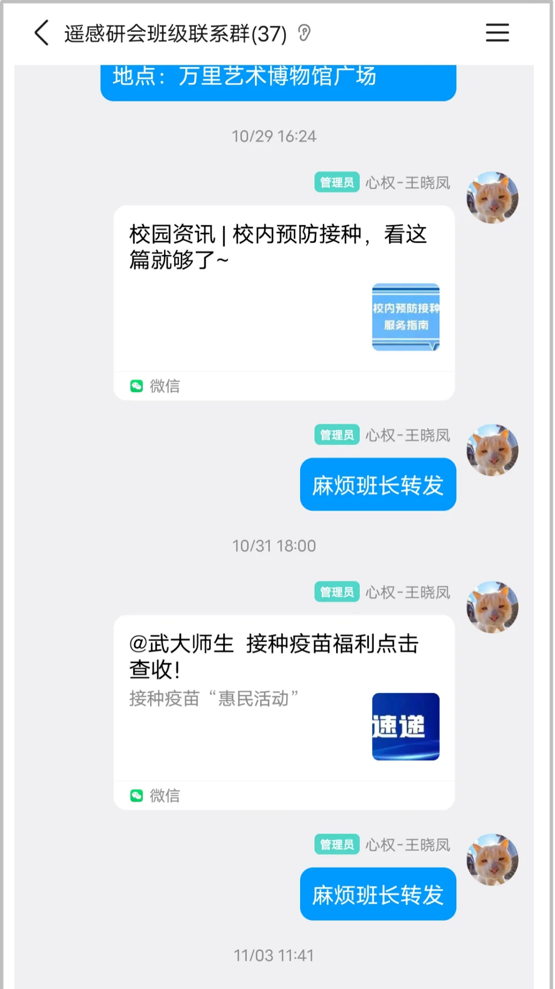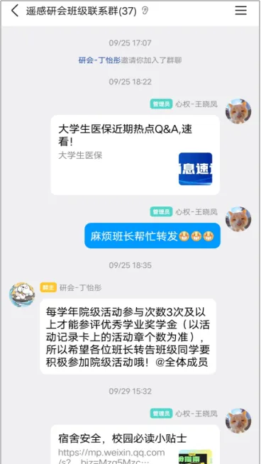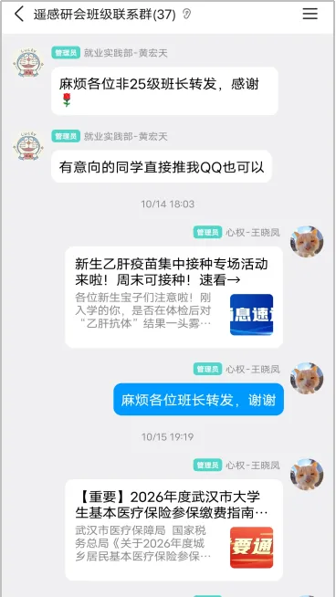 持续关注与同学们密切相关的各类校院通知与权益动态,多平台及时转发宣传,畅通校-院-班信息渠道,做好同学们的“传声筒”。