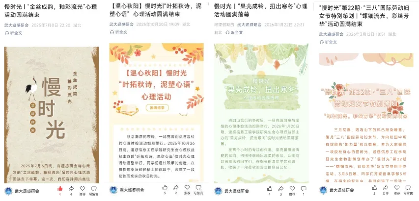 在第八届研究生心理健康节中举办“朋辈课堂”活动,开展“慢时光”系列心理活动4期,承办温心秋阳工程活动,累计吸引300余人次参与。