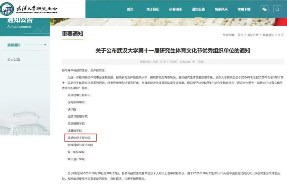 “武汉大学第十一届研究生体育文化节优秀组织单位”获评公示