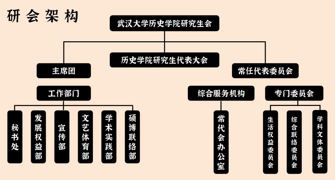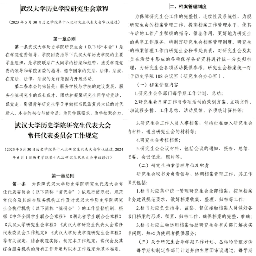 历史学院研究生会实行研究生代表大会制度,按照《武汉大学研究生会章程》《武汉大学历史学院研究生会章程》开展工作。主席团实行集体负责制、执行主席轮值制,全面统筹规划研会各项工作。