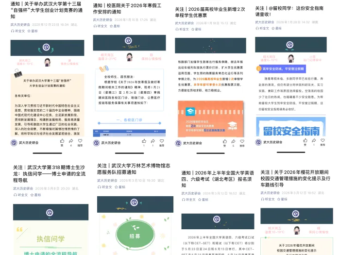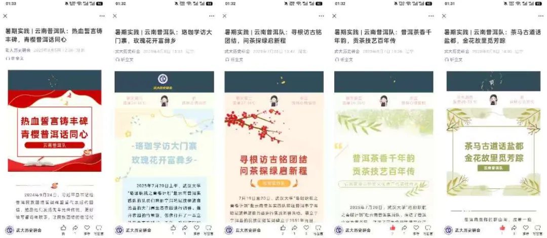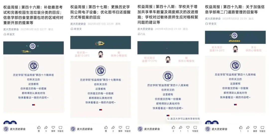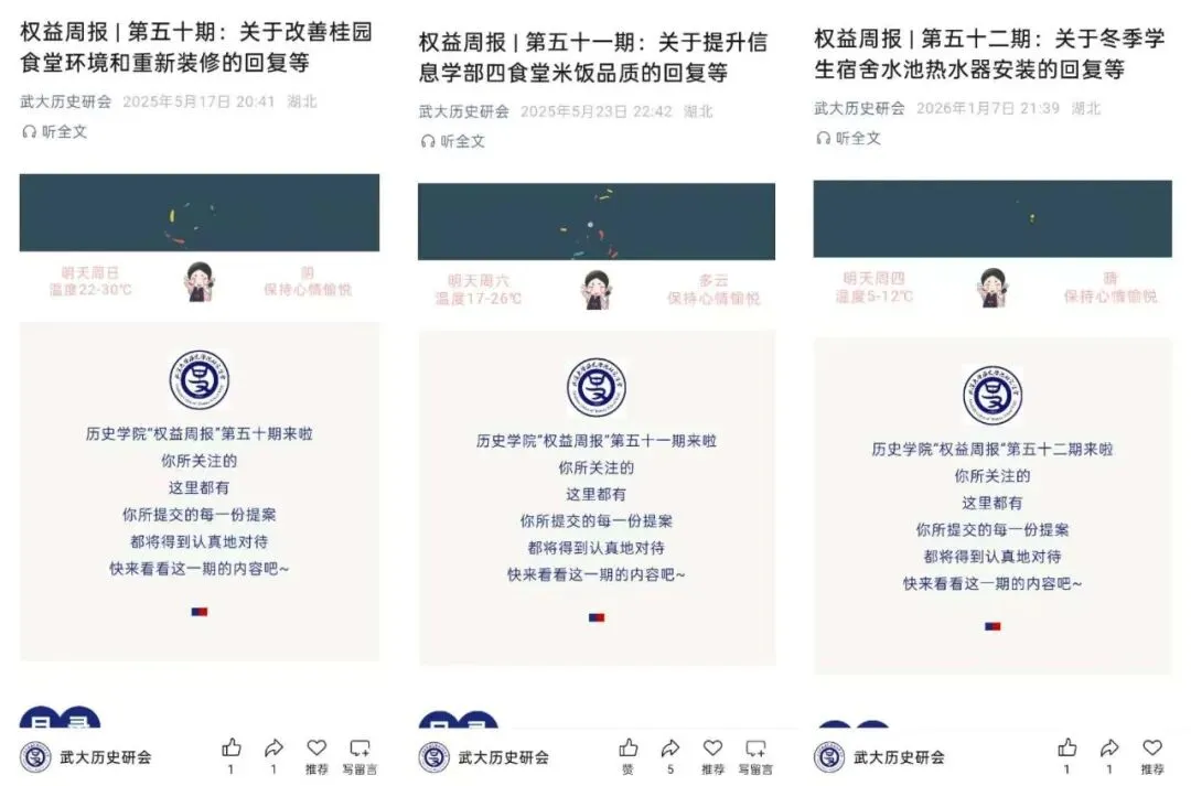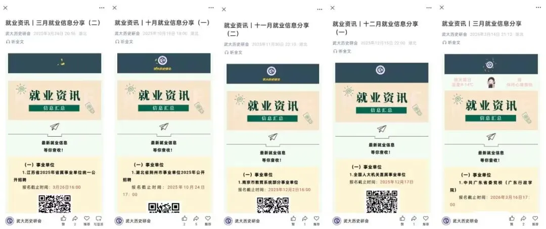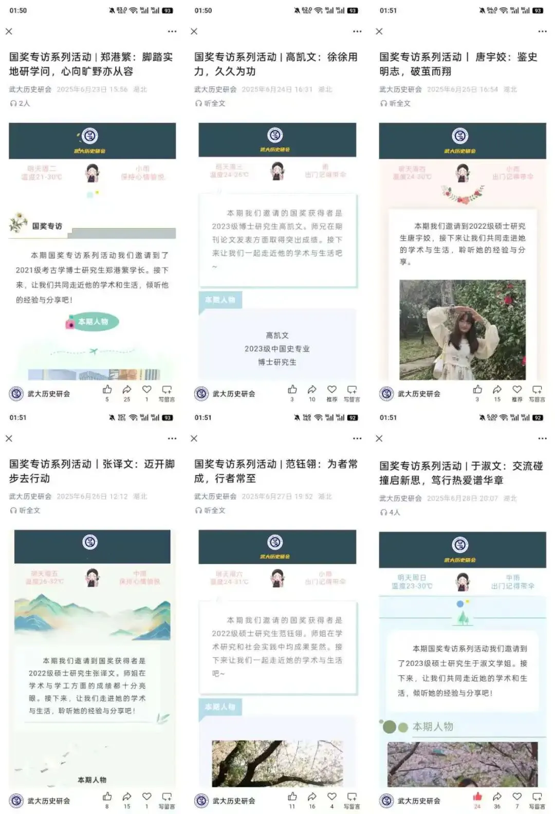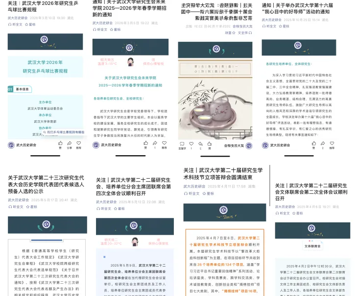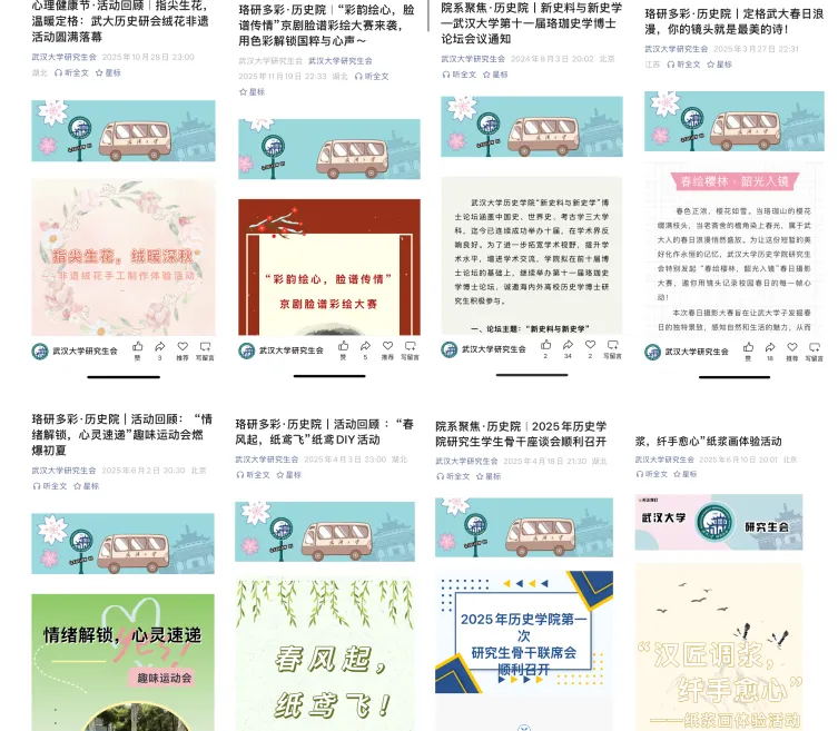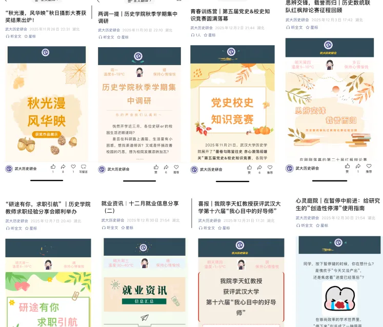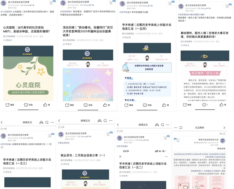 武大历史研会微信推送年度总阅读量达到23.18w,共推出推文526篇,微信转发校研究生会推文46篇,向武汉大学研究生会微信公众号等校级媒体投稿13篇,分享次数2127。公众号现有粉丝7094,新增粉丝量1042。微博发文12篇,制作海报等各类物料30余项。