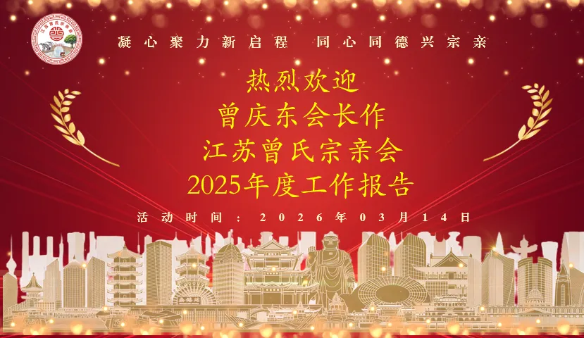 回望2025,我们同心同德、硕果盈枝;展望2026,我们信心满怀、步履坚定。新的一年,江苏曾氏宗亲会将始终以传承曾子文化为己任,以凝聚宗亲力量为核心,以推动家族兴盛为目标,团结海内外全体曾氏宗亲,同心同德、携手共进,奋力书写江苏曾氏宗族事业高质量发展新篇章,让曾氏文脉源远流长、家族兴旺永续!