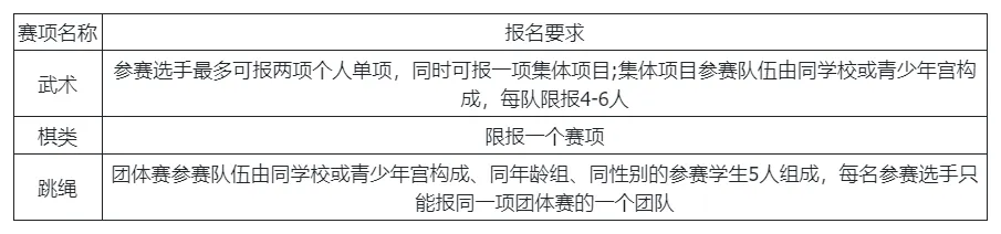 共三大类:武术、棋类(围棋、象棋、国际象棋)、跳绳。含个人与集体/团体项目。