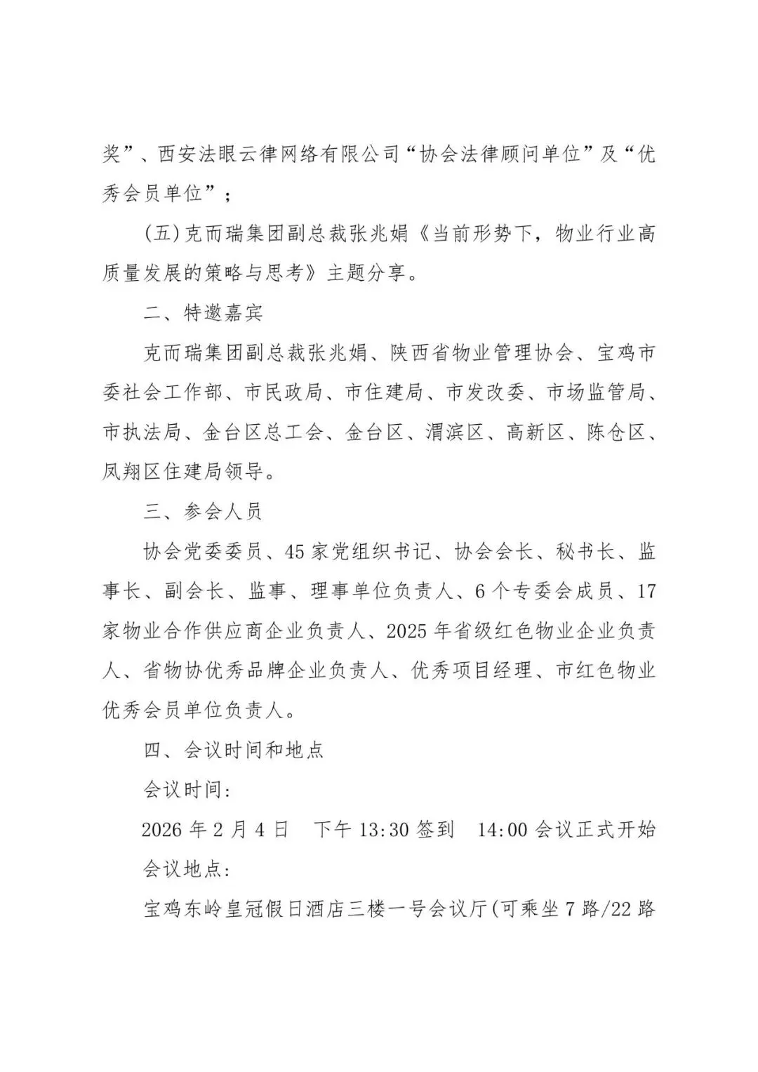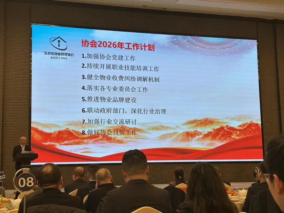 2026年2月4日下午,宝鸡市物业管理协会党建引领·共建美好家园工作推进会在东岭皇冠假日酒店一号会议厅召开。宝鸡200家知名物业公司总经理参加会议,宜刻法人杨清苗女士应邀参加本次会议,并携手全体物业公司,实施城市《一刻钟便民生活圈》,共建民生工程,本次会议圆满举行。宜刻负责人杨清苗女士,耗资百万打造物管系统,整合宝鸡10万优秀商家资源,实施物业费补贴项目。宜刻公司面向宝鸡物业协会内30家优秀物业公司,免费开通物管系统,协助物业解决物业费难收的问题。链接各大物业公司和商家,实现“让天下百姓不再缴物业费”的愿望。宝鸡物业协会党委书记、会长方纪林、副书记、秘书长陈良、党委委员、监事长徐雪萍、党委委员、常务副会长翟亮,各物业企业党组织书记、副会长、副秘书长、监事、理事会员单位共计200多人出席了会议。本次大会由协会党委委员、副秘书长段新妮主持。本次会议圆满完成了各项议程。这是一次凝聚力量、团结奋进的大会,统一了思想,凝聚了共识、明确了2026工作任务和重点部署,更加坚定了我们在新时代新征程开拓进取、攻坚克难、扎实推进宝鸡市物业行业高质量发展的信心和决心。