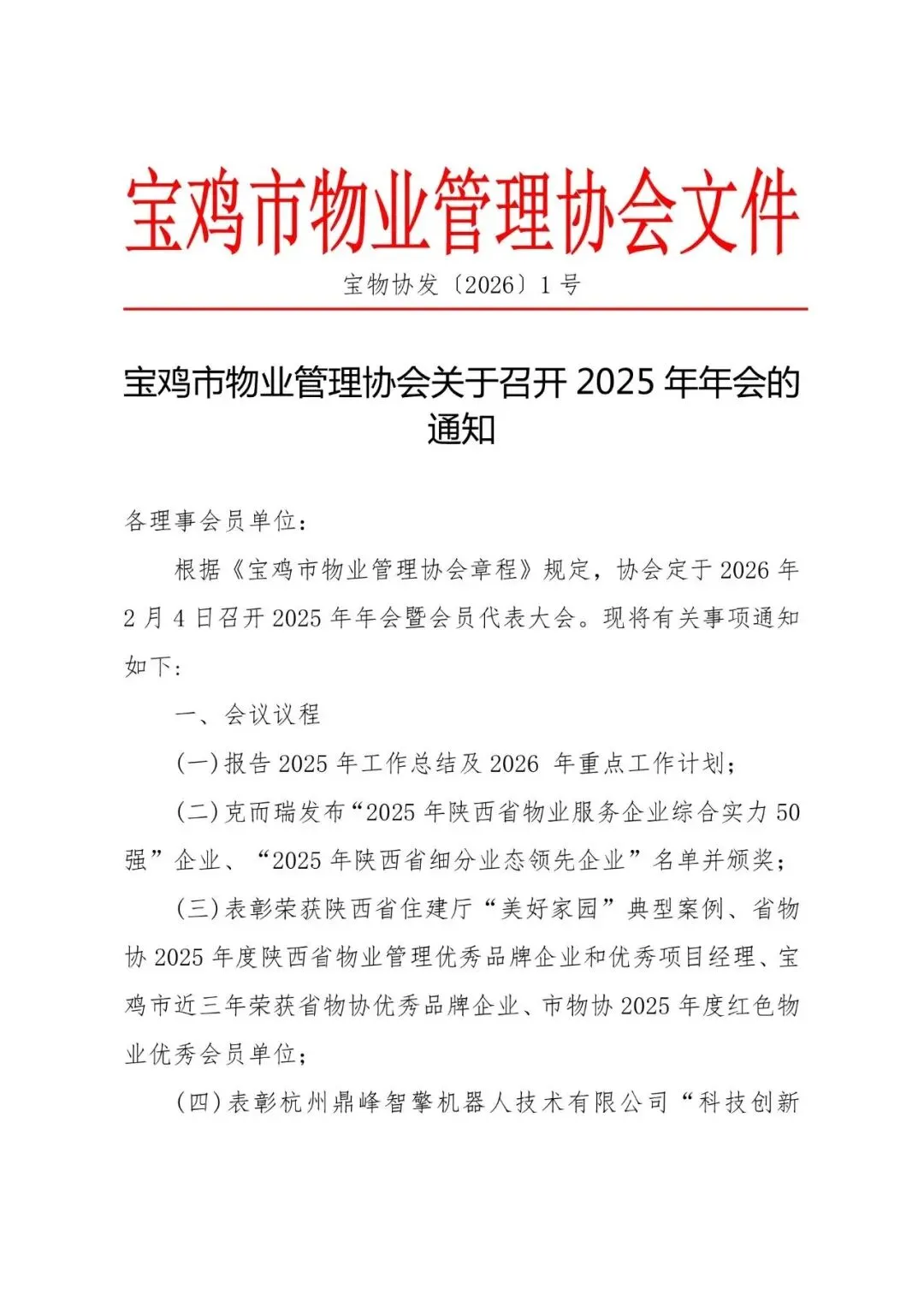 击鼓催征再奋进,昂首阔步启新程。2026年宝鸡市物业管理协会将在市社会组织党委、市相关部门和全体会员的大力支持下,进一步发挥好桥梁纽带作用,强化党建引领,坚持与时俱进,不断强化服务国家、服务社会、服务群众、服务行业的功能,推进党建与业务深度融合,全力推进美好家园建设,不断满足人民群众对美好生活的向往,奋力开创宝鸡市物业行业高质量发展新局面!