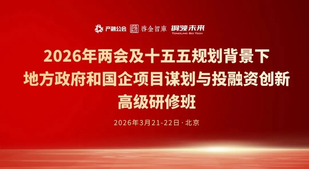 产融公会 & 启金智库 联合 铜领未来 将于 2026年3月21-22日(周六/日)在北京举办城镇化投融资高级研修班第30期《2026年两会及十五五规划背景下地方政府和国企谋划项目与投融资创新高级研修班》,欢迎地方政府党政主要领导、相关职能部门领导、城投国企高管、金融精英、建企投拓骨干、咨询服务机构等参会交流,助您建立展业必备的知识体系、实战技能、案例经验和有效人脉,诚邀参加!