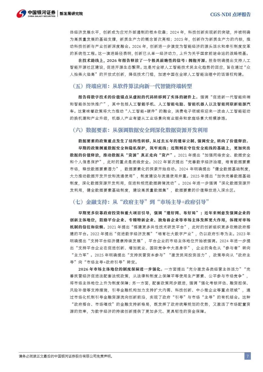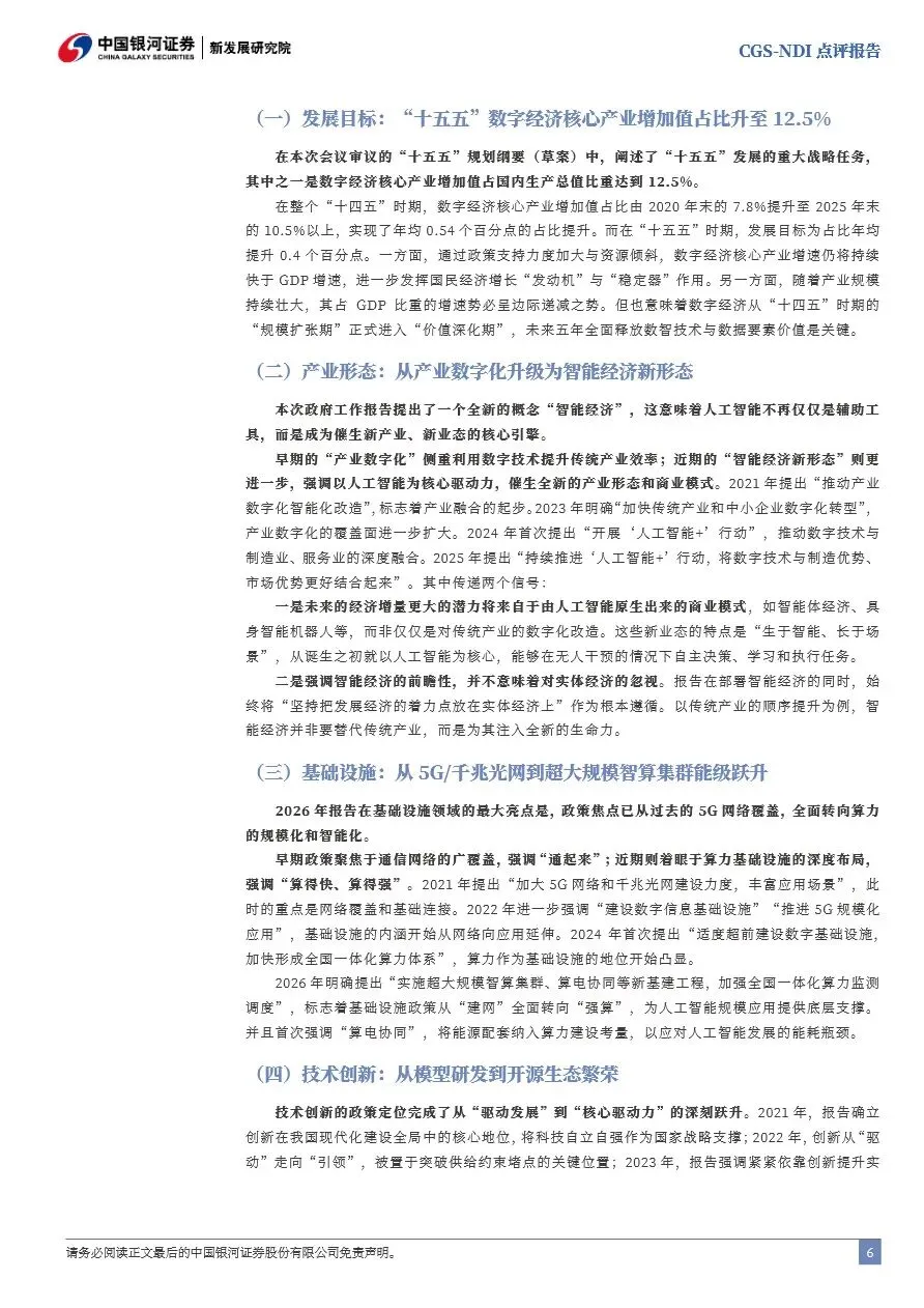 2026年政府工作报告在科技创新领域展现了前瞻性和战略性的布局,明确提出将数字经济核心产业增加值占GDP比重提升至12.5%,标志着数字经济将成为推动国民经济增长的重要引擎。报告首次提出“打造智能经济新形态”,将人工智能从技术工具升维为经济形态,强调其对经济社会的全面重构作用。为此,政府将加大在算力基础设施、技术创新路径、终端应用推广、数据要素开发利用及金融支持机制等方面的政策倾斜与资源投入,旨在构建一个以智能经济为核心,强大算力为底座,开源生态为活水的高质量发展蓝图。