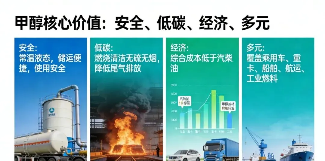 甲醇的核心价值,在于安全、低碳、经济、多元四大优势。常温常压下为液态,储运便捷、使用安全,契合现有能源基础设施;燃烧清洁无硫无烟,可大幅降低尾气排放,助力“双碳” 目标;综合使用成本低于汽柴油,经济效益突出;既可用于乘用车、重卡,也能服务船舶、航运、工业燃料,覆盖多领域低碳需求。