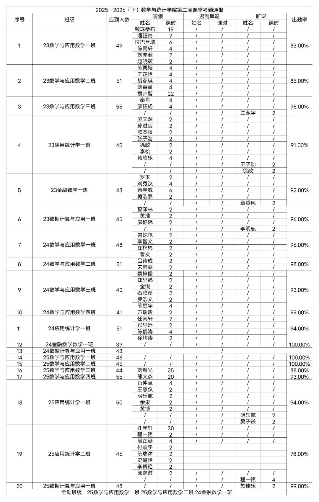 全院班级出勤整体向好,亮点突出。其中24级金融数学1班、25级数学与应用数学1班、25级数学与应用数学2班出勤率达100%,24级数学与应用数学4班、25级数据计算与应用1班出勤率超98%,多班级尽显数统学子勤学善思的优良学风。同时,部分班级存在提升空间,25级数学与应用数学3班、25级应用统计学2班需重视课堂出勤,个别同学累计请假课时偏多,25级数据计算与应用1班存在旷课情况。学院将对相关班级开展专项督导,精准帮扶促提升,推动全院学风持续向好。