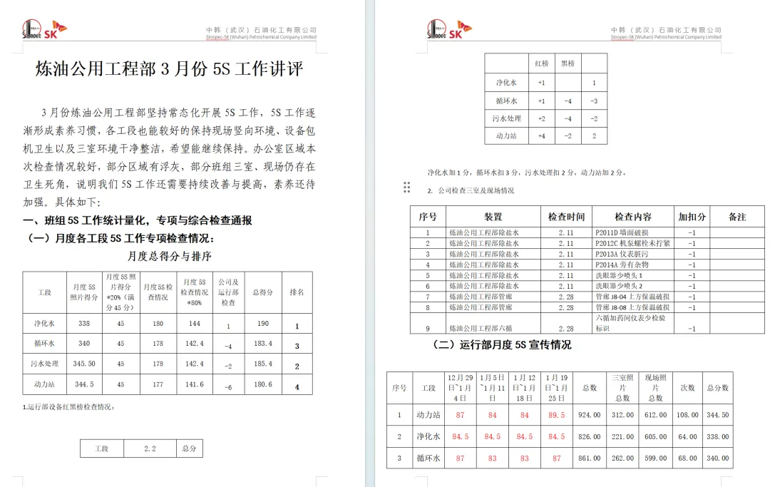 以持续改善为目标,以5S网格化履责为统领,以全员动手为着力点,以现场整治和三室提升为切入点,以周检查和问题台账为抓手,重点围绕“标准化装置创建、专项工作集中整治、现场改善为亮点推广”三条主线,全面推进运行部5S工作改进,职工素养不断提升。