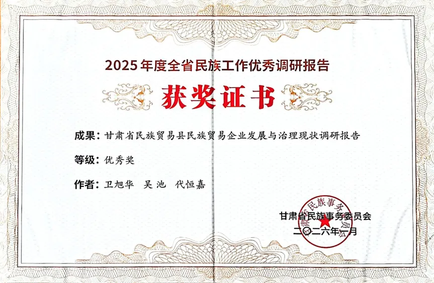 近年来,我院持续关注民族地区经济社会发展与治理问题,积极组织开展相关领域的调查研究,形成了一批具有重要决策参考价值的研究成果。我院报送的调研成果先后获评全国民族工作优秀调研报告和甘肃省民族工作优秀调研报告,充分展现了学院在民族地区治理研究方面的学术积累以及服务国家战略和地方发展的能力。