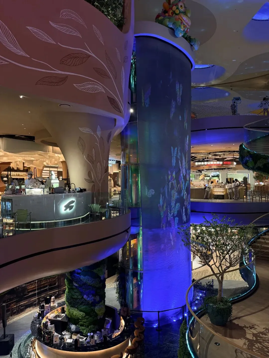还有贯穿三层空间的16米冷却瀑布。不是简单的景观装置,而是一个辐射冷却系统,通过水幕蒸发来调节温湿度,降低空调能耗。站在瀑布旁边,能明显感觉到温度低几度。