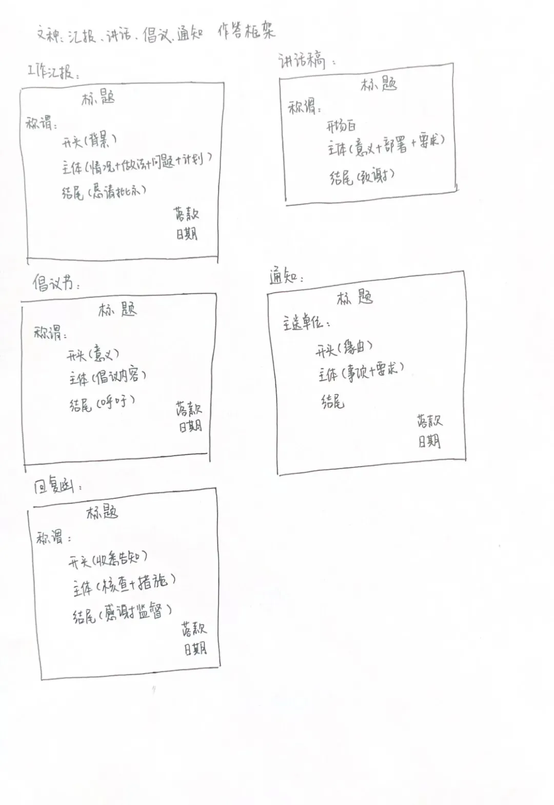 工作汇报、讲话稿、倡议书、通知、工作函等公文写作框架